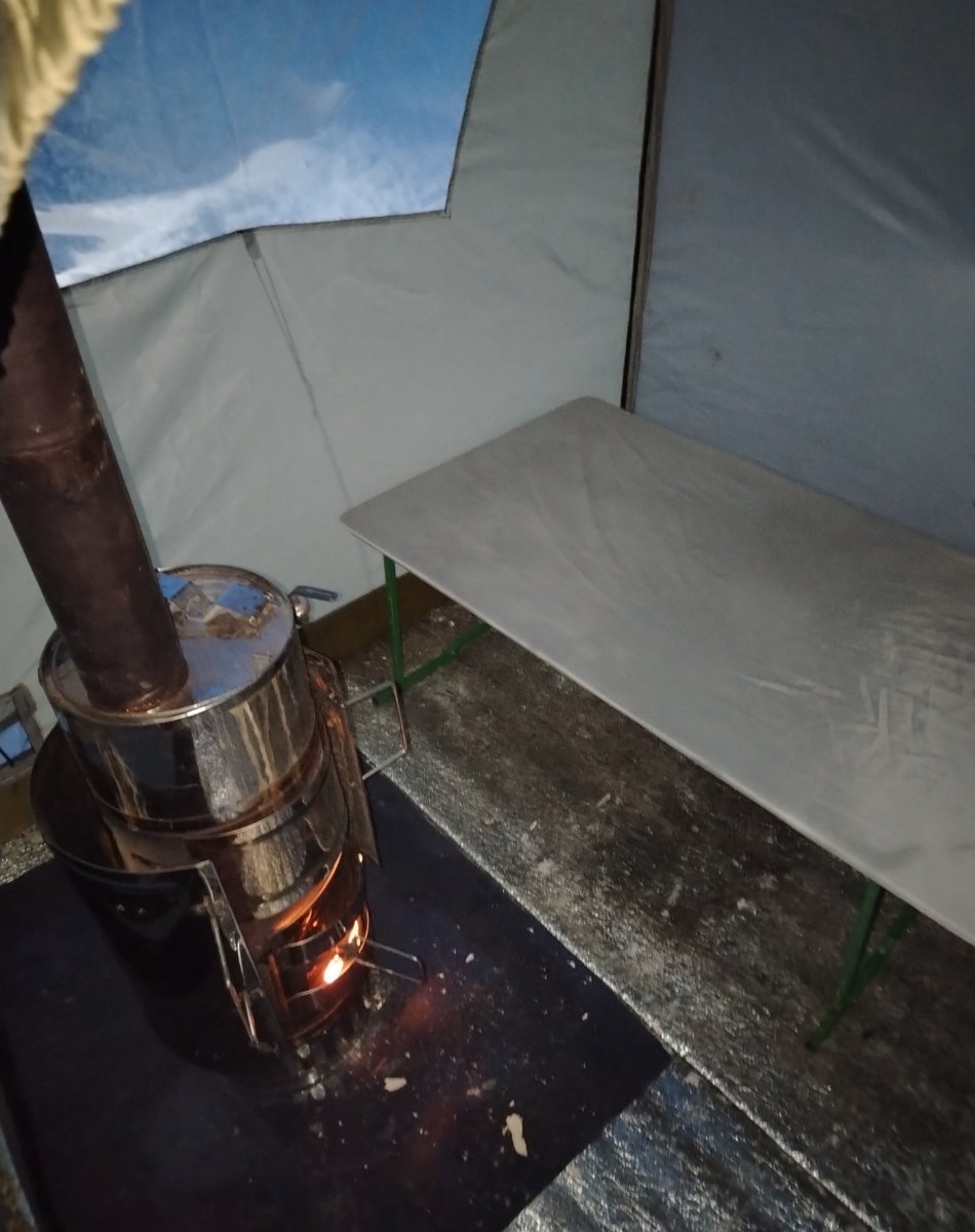Проснулся вчера после ночной смены, написал друзьям, с предложением вечером поехать в баню, но никто не захотел. Поэтому взял жигу-3, самодельную палатку из каркаса мб-10, складной полок/кровать. На улице минус 10, штиль, как раз хотел проверить прокачает в один слой или нет. Приехал на свой любимый карьер, он в 20 минут езды от города, обычно там не людно, а мне последнее время нравятся тихие места.