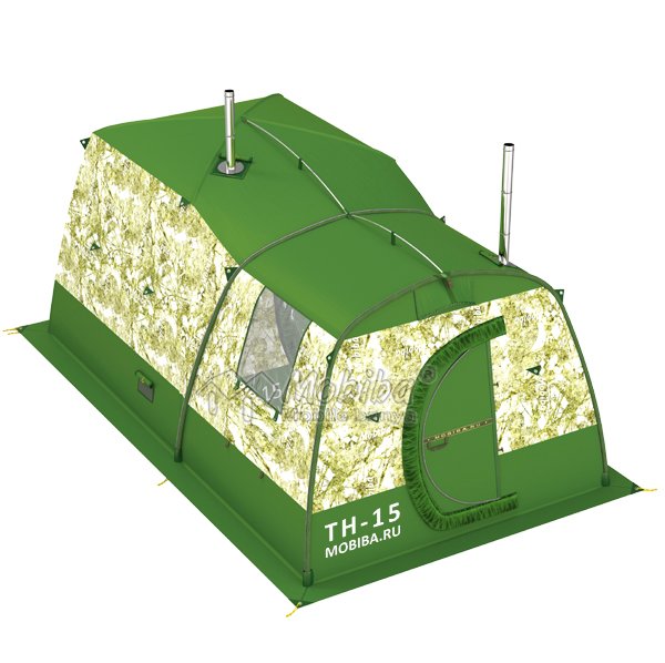 Накидной тент увеличивает площадь, добавляя тамбур к «Мобиба МБ-15» (или МБ-15 СП). Позволяет использовать палатку в качестве бани в любое время года, даже зимой до -20°С. Благодаря дополнительному тенту баня дольше сохраняет тепло.