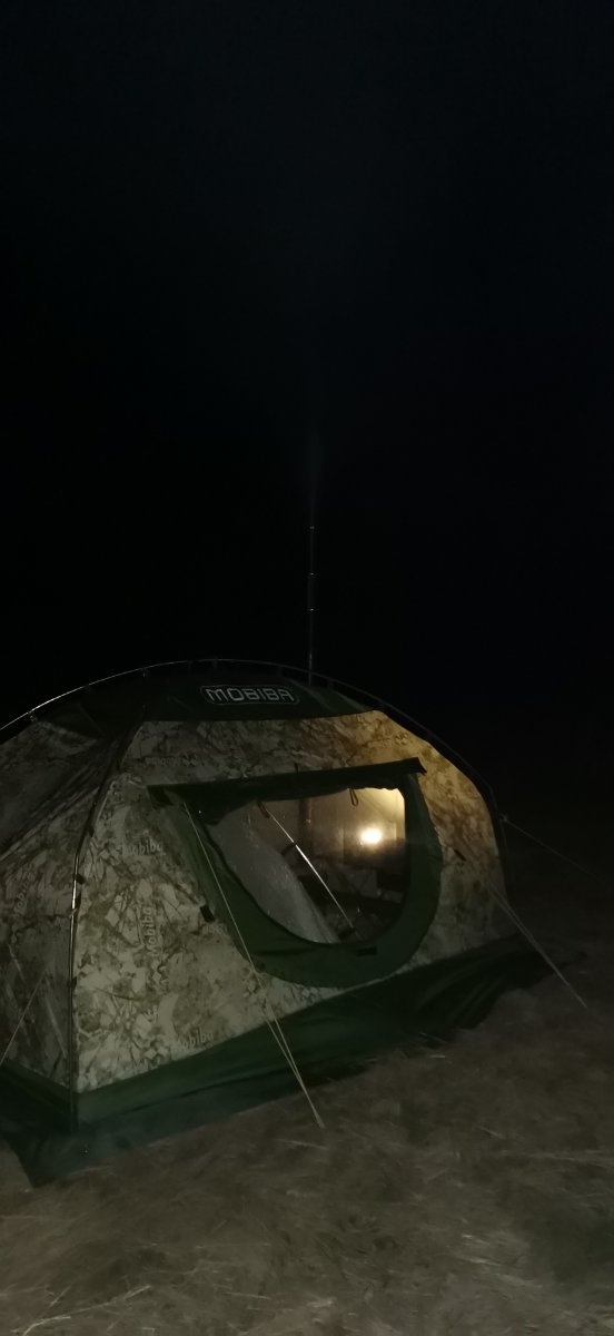 Установил палатку и печку. Растянул для начала на все растяжки. Потом часть оптимизировал, а часть со стороны входа пока вообще убрал. Затем установил внутри обычную двух местную туристическую палатку, в качестве защиты от насекомых. Поместилась впритык, чуть оттянув тент. Собираюсь по центру длинной стороны юбки усилить куском пвх и поставить люверс. Вид внутренней палатки. Дальняя стенка чуть провисает, но с надувным матрасом все натягивается как надо. Забравшись во внутреннюю палатку захотелось повернуть печь на 90*, чтобы ночью не вылезая полностью, можно было регулировать поддув или подбросить топлива. Ну и вид изнутри через окно, уже без внутренней палатки. В процессе эксплуатации еще натяну небольшой тент над входом, от дождя, а может он и не понадобится.