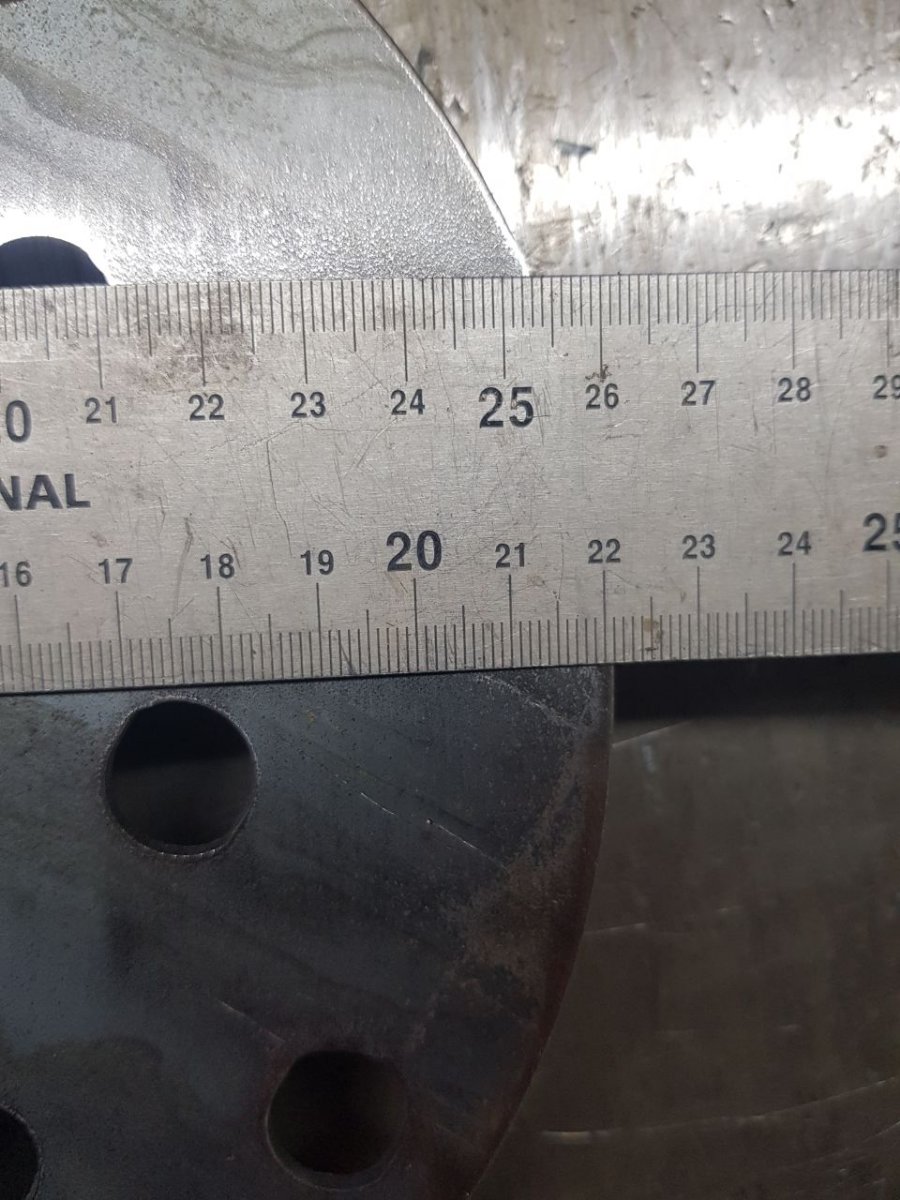 Диаметр 222. толщина 2.5 мм. Все опасаются что поведет. За пару лет не повело, а уж если , то просто молотком стукнуть.