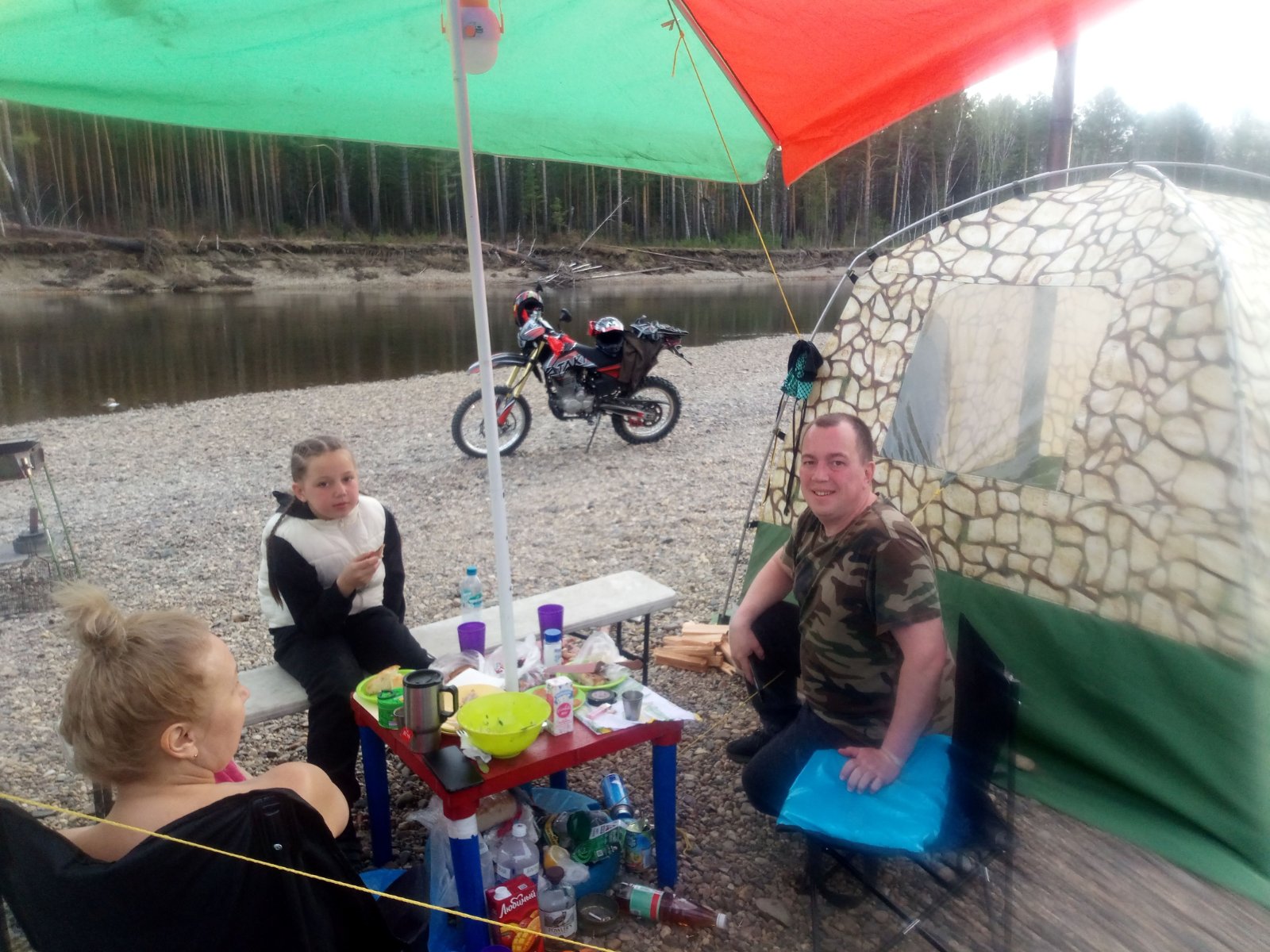 Приятный сюрприз - в поисках хороших мест совершенно случайно сюда приехал на мотоцикле мой товарищ-мобибиец Андрей с 10-летней дочерью. Мы буквально пару дней назад разговаривали с ним и планировали мобибовыезды на мотоциклах, и вот встретились на берегу. Ребята в аккурат приехали к мясу. Покушали, попили чай и поехали дальше.