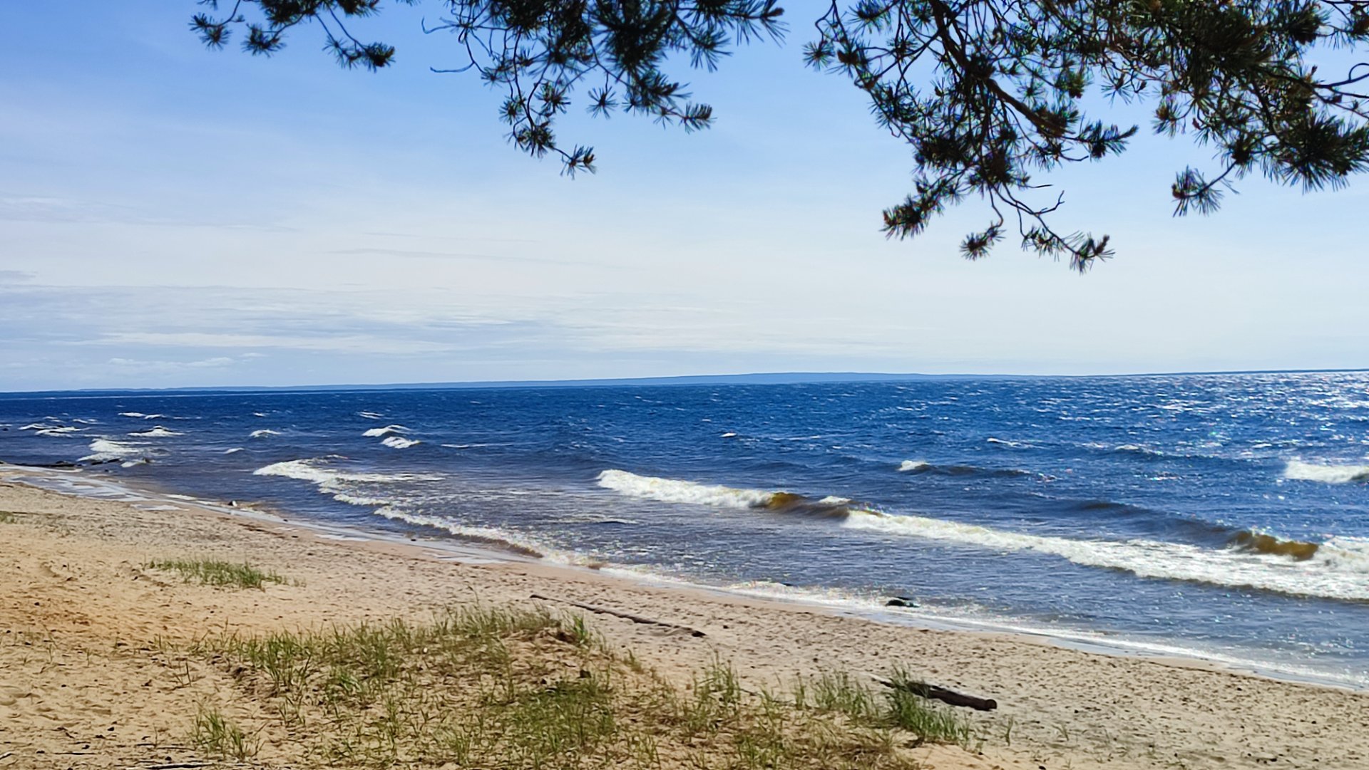 Красота. На Челмужская коса, похоже, дальше в нос, с видом на открытое озеро, справа длинный остров.