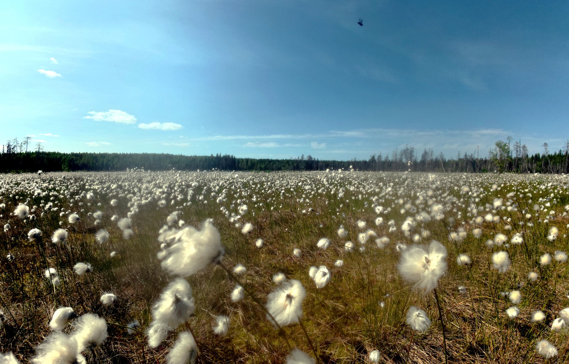 Поэтому утром чай, сборы, и в путь, прорубать дорогу. В этот поездке всё получается. Навигатор не теряет жпс и показывает треки, бобров, похоже, зимой съели волки, мостики, застеленные в том году, удаётся проскочить без потерь. Остановились передохнуть возле знакомой ламбушки – тот год знатно обрыбились. Но сегодня всего одна щучка-вовсю цветёт вода. На болотах красота - цветёт пушица, северный хлопок. Дорога растворяется в подлеске за километр до цели. Ну что-ж, раскатать болотники, снасти в руки-и вперёд, сегодня мы не отступим.