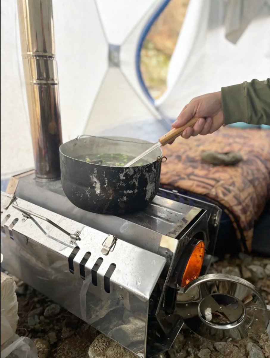 И в моем случае, именно заднее положение дымохода у печи, выдвигает её вперед к центру палатки, что как-раз таки увеличивает шанс обжечь пользователя и в целом занимает полезное местно в центре палатки.