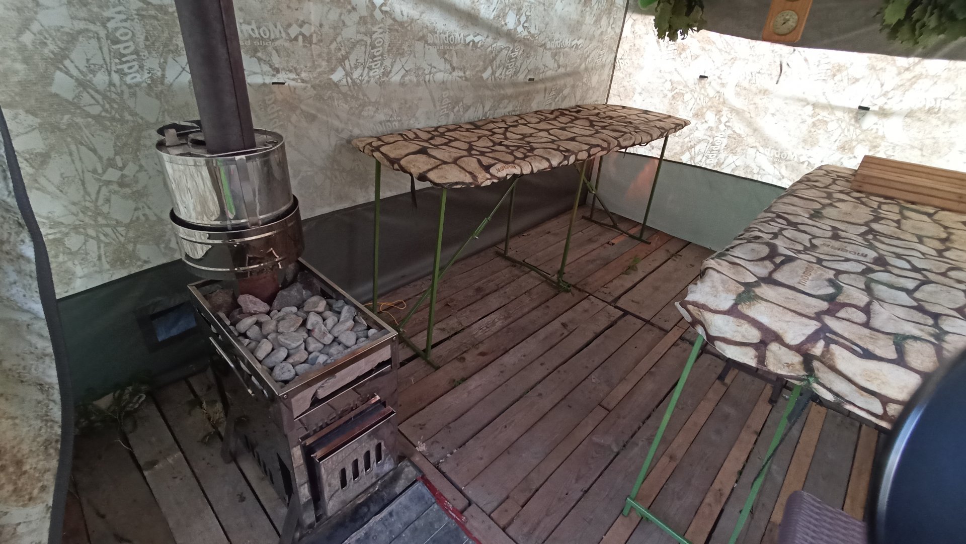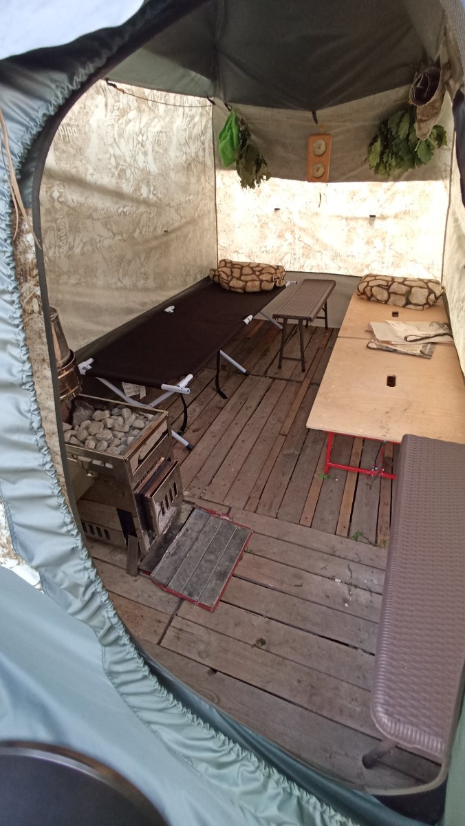 Чем и хорошо такая баня на участке дома или сада, это как пробник, можешь менять габариты бани(палатки) и печи,паровая или суховоздушка. Нет привязки к месту(земле) на участке, можешь развернуть,поставить как хочешь и подобрать свой размер и пар.