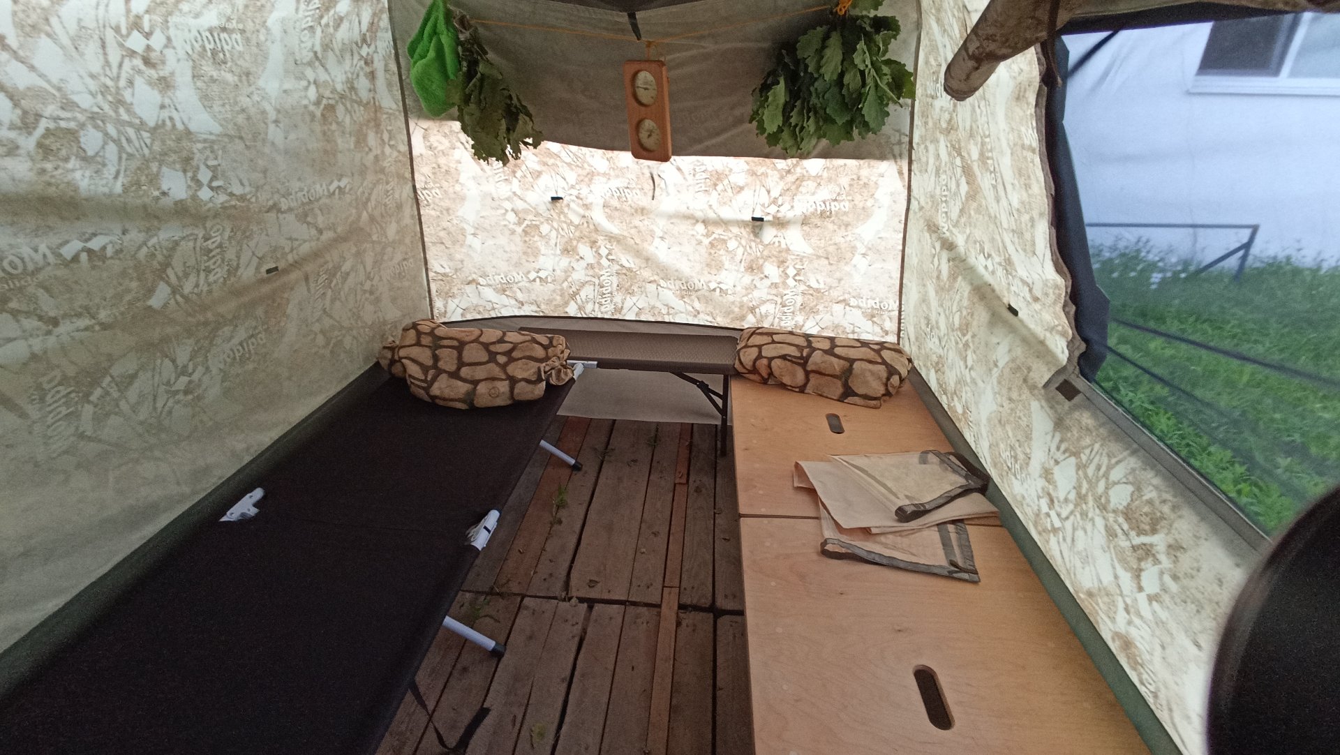 Очередная баня. Решил сделать замеры температуры и посмотреть как нагревается каркас и сама палатка. Первые замеры делал неделю назад,9 августа. Баня была уже поздно,целый день был дождь, приехали к вечеру и затопил ближе к 22 часам.