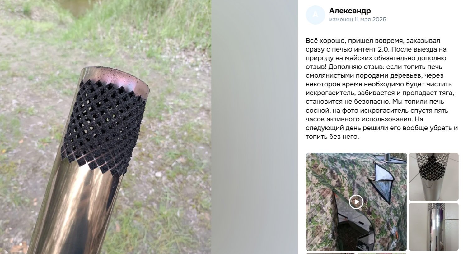 Мы все это тоже тестировали в свое время. Ведь хочется же, чтобы искры не прожигали палатку? Так заманчиво - одел некую недорогую штучку на дымоход - и готово! Ан, - нет! Быстро зарастает сажей. Сами добровольно в итоге снимете и выкинете эту штуку. Если еще живы будете. А значит и выкинете деньги, которые были на нее потрачены. Сам производитель прекрасно информирован, что продает и какой будет результат. Я его в свое время информировал, что мы такое производить не будем и ему как нашему дилеру такие штуки продавать запрещаем. Но теперь он не наш дилер и творит на свое усмотрение что вздумается. Лишь бы деньги с людей получить, а там хоть трава не расти!