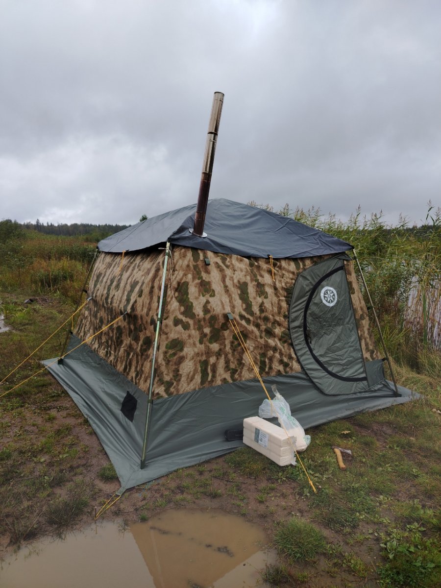 Воскресенье, вечер, мы с другом берём рс-33 и паробомбу-3, едем проводить последний летний день лета. На улице 15 градусов тепла, моросит мелкий дождь, на воде никого, кайф! Ставим палатку, затапливаем печь, ложимся на полки и кайфуем от размеров рс-33, насколько же удобно в ней, место для двоих с большим избытком. Паробомба-3 с легкостью прокачивает такой объем, даже приходится ее морить легким голодом, иначе она покажет свой нрав и нам придется париться с открытой дверью.