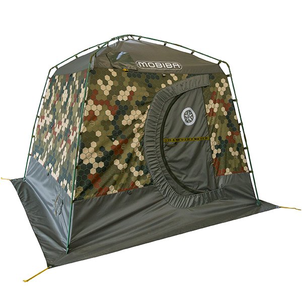 Мобильная баня-палатка «МОБИБА МБ-15 СП» со съемным окном размером 700х700 мм и с антимоскитной сеткой в распашной двери. Возможность использования стен в качестве навесов, превращая палатку в веранду.