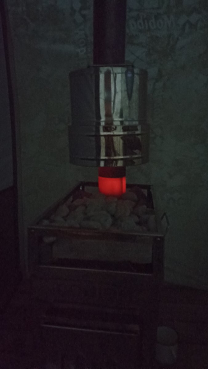 В небольшом объёме парилки МБ-103,2×1.9×2 метра, с застегнутой перегородкой, между печкой и лавочкой,надо ставить что то, типа ведра плоского с водой, от открытой полости куда убираются ножки в транспортное положение, сильно лучит, лавочка нагревается, пипец.