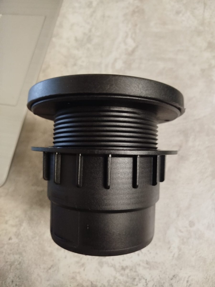 По заявке одного из клиентов мы врезали ему металлическую разделку в нижнюю часть стены. И в отверстие разделки он завинтил вот такой переходной узел для воздушного отопителя.