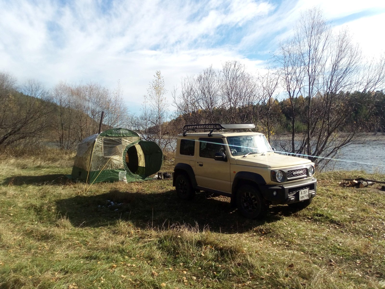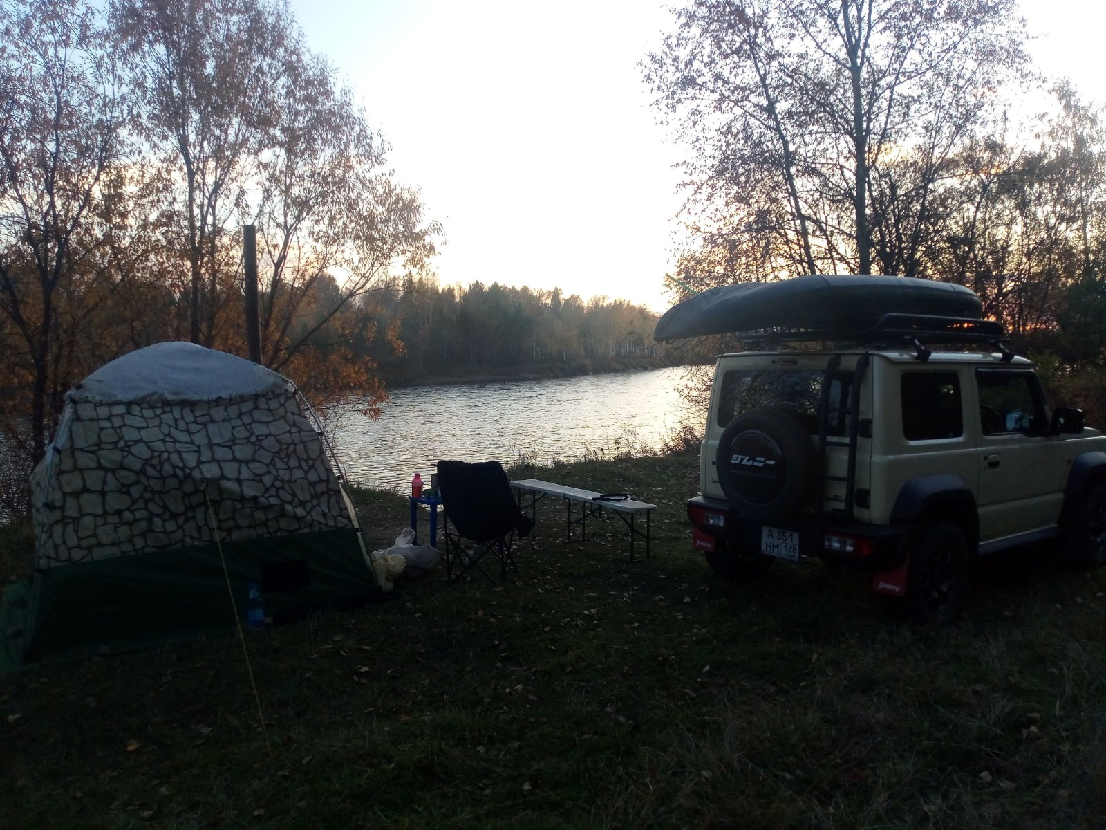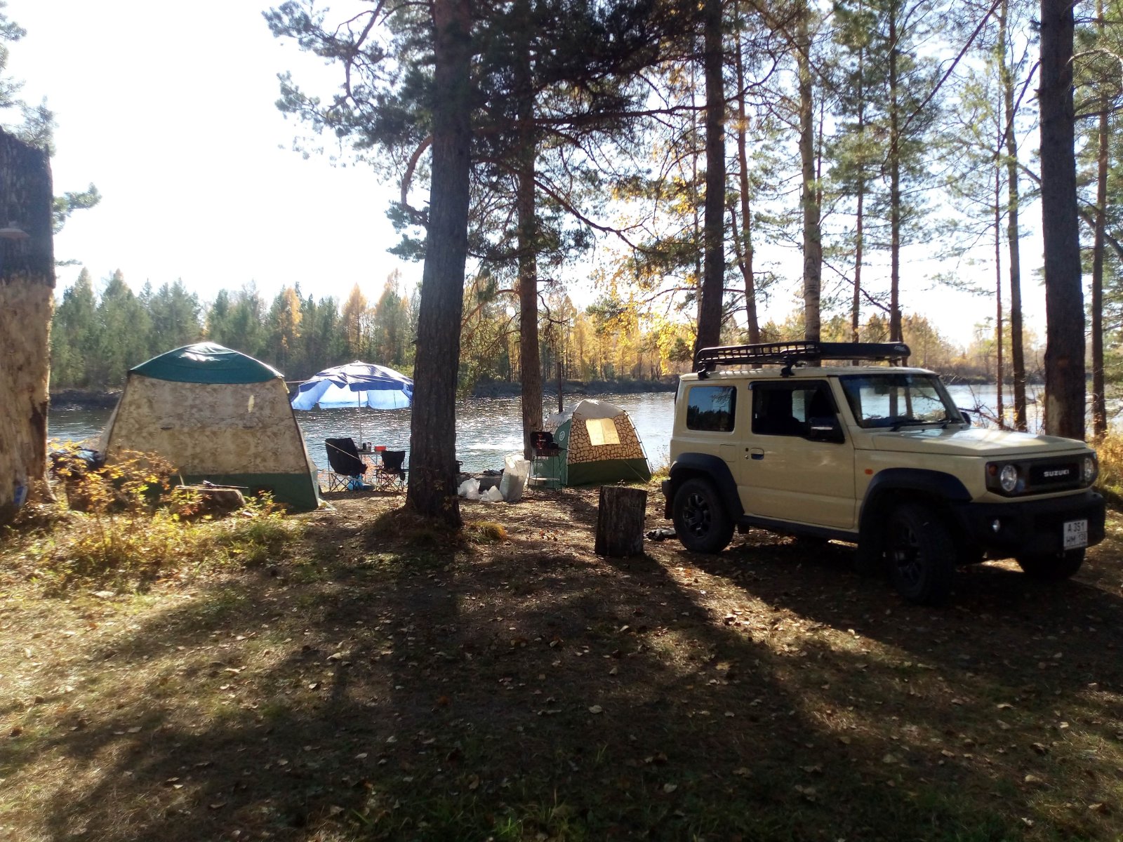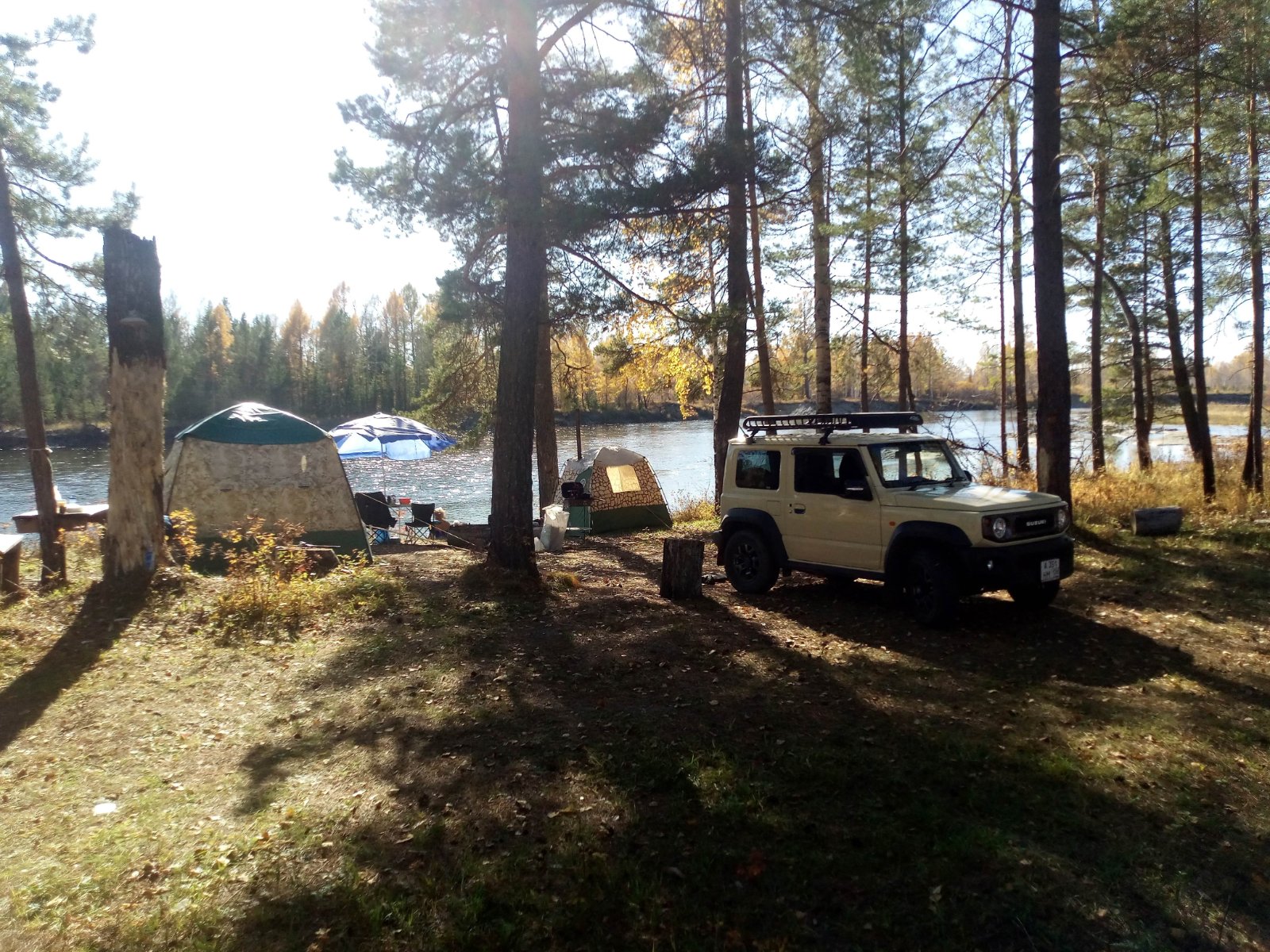 Но у нас есть такое место, всего лишь в 51 км от города. Всё лето оно было занято совхозными пасечниками, но в начале осени они съехали, оставив нам относительно чистую и ухоженную поляну. Дорога сюда крайние 10 км ведёт по подсохшей болотине, и я засаживал здесь Джимника в прошлом году. Но в этот раз даже передок не пришлось включать.