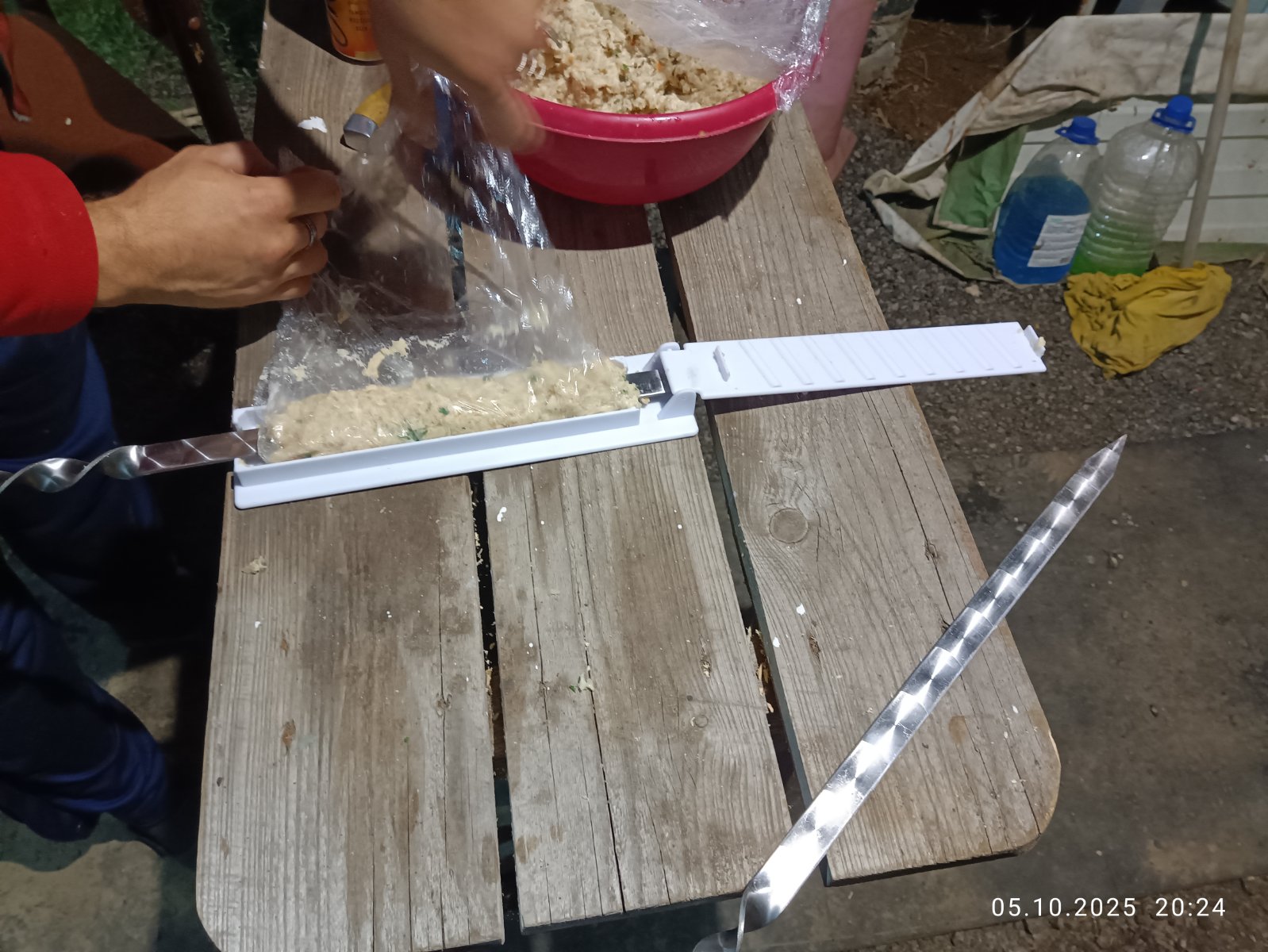 А не сделать ли нам завтра люля-кебаб, решили мы. На следующий день обещали мелкий дождь, поэтому мангал затащили под навес. Жена подарила приспособу для формирования люля-кебаб, ей и пользовались. Ещё я купил под люляшки широкие шампура.