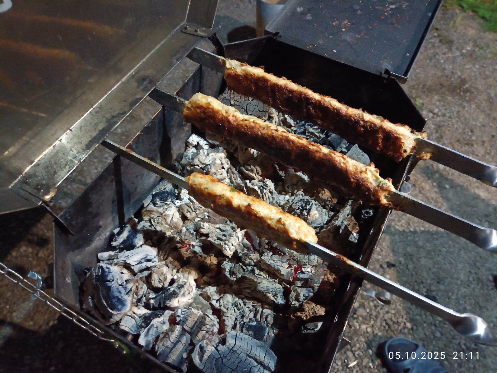 А не сделать ли нам завтра люля-кебаб, решили мы. На следующий день обещали мелкий дождь, поэтому мангал затащили под навес. Жена подарила приспособу для формирования люля-кебаб, ей и пользовались. Ещё я купил под люляшки широкие шампура.