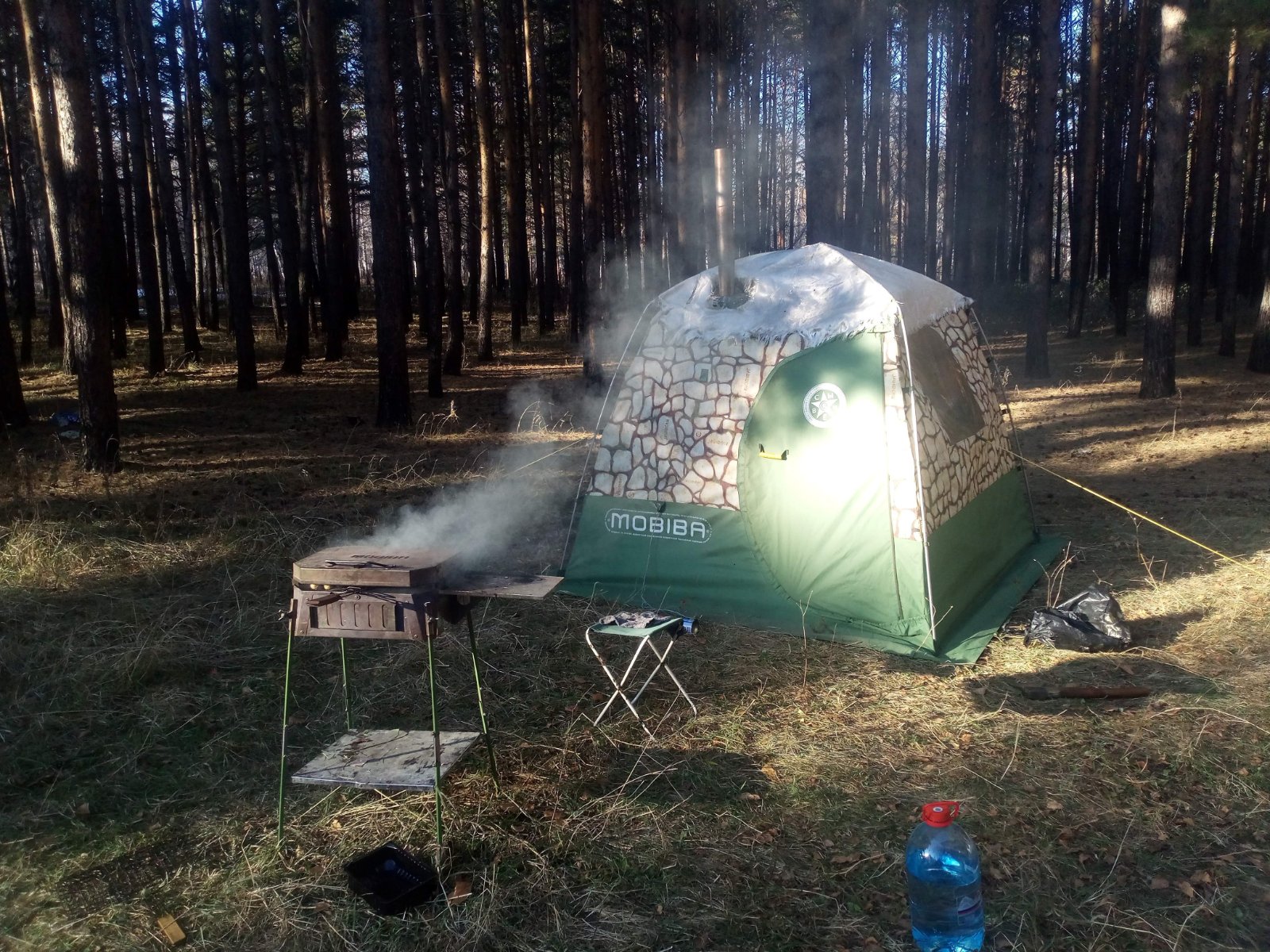 На выходных выбрались в лес на нашу поляну. Жене захотелось сёмги жареной. Давай, говорит, без палатки, просто в лесу посидим. Но я, как старый мобибиец, ещё позавчера ночевавший в Мобибе при - 16, на это дело не повёлся и взял с собой К5 с Дюночкой.