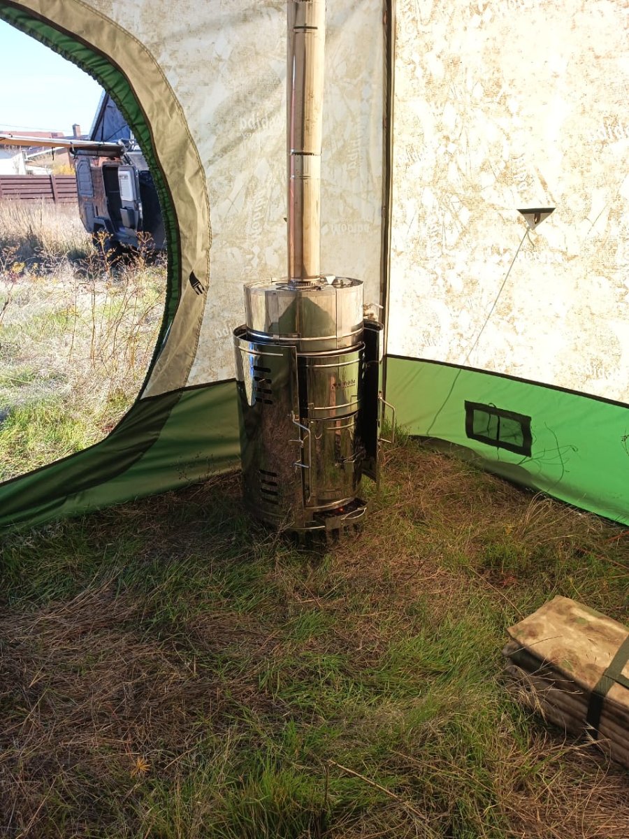Комплект приехал раньше срока, как раз под выходные! Соответственно, удерживать себя от искушения попариться я не стал. Поехал со всем этим на дачный участок. Прокалил сначала печь на воздухе. Потом, собрав палатку, начал испытания. Ну что сказать... Ранее не приходилось юзать тонколистовые печи, всегда имел предубеждение в сторону толщины и массивности. Ан, нет, сей девайс очень даже неплох, прям разрыв шаблона!