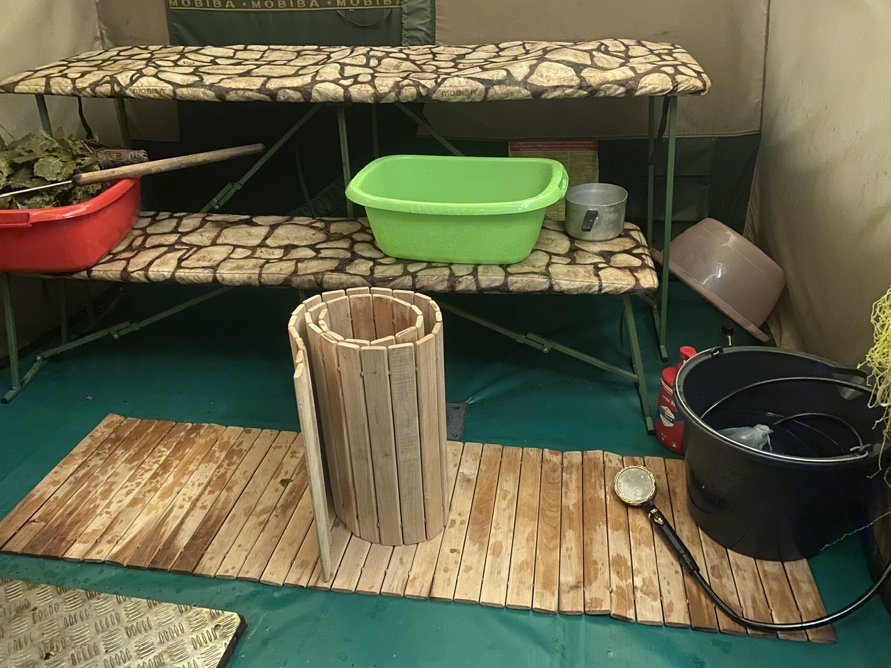 Вчера, после плодотворных трудов, устроил себе банный релакс. Время около 21.00, Температура за бортом +9. Палатку поставил прямо во дворе.