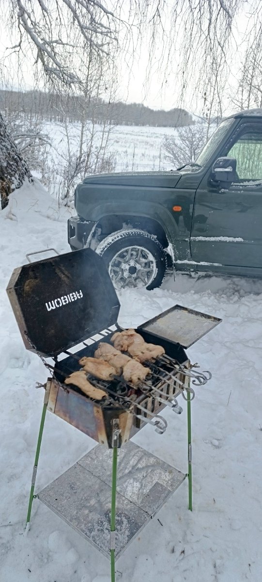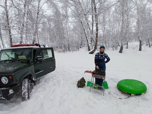 Привязали на крышу джима два тюбинга. Взяли Шикардос, уголь, мяско. Погнали в ближайший лес(около 30 км). Мне забава кататься по горкам, по снегу на полном приводе, детям весело на тюбингах.