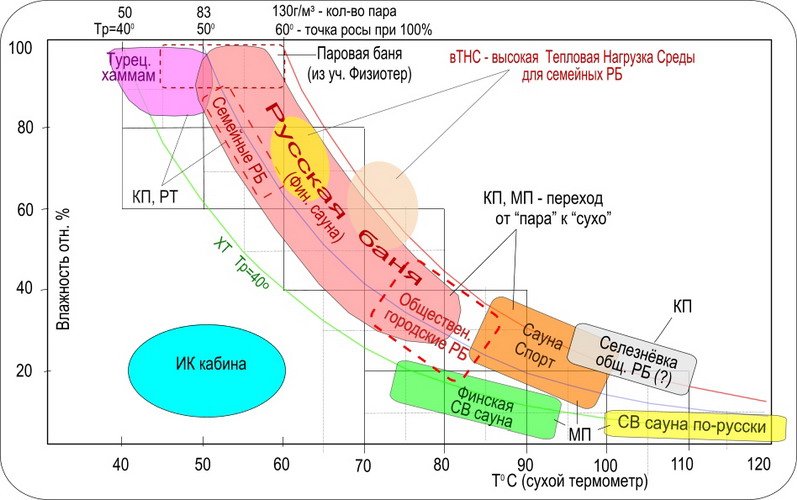 При этом влажность и температура находятся в прямой взаимосвязи. Грешь сильнее - влажность падает. Смотрите на график. Сложность заключается в том, что человеку трудно перешагнуть стереотипы мышления. Как температурой управлять большинству очевидно. Ставь мощнее печь, утепляй стены. При этом забывают, что стены, потолок, пол помещения - это тоже участники процесса. Они тоже участвуют в создании атмосферы внутри парилки.