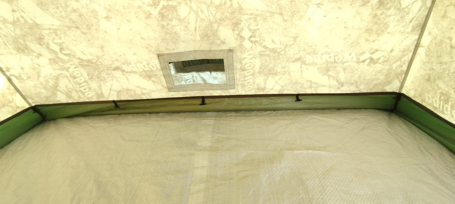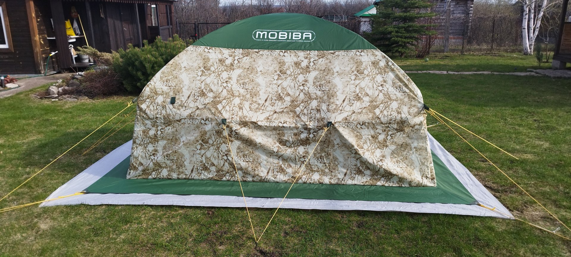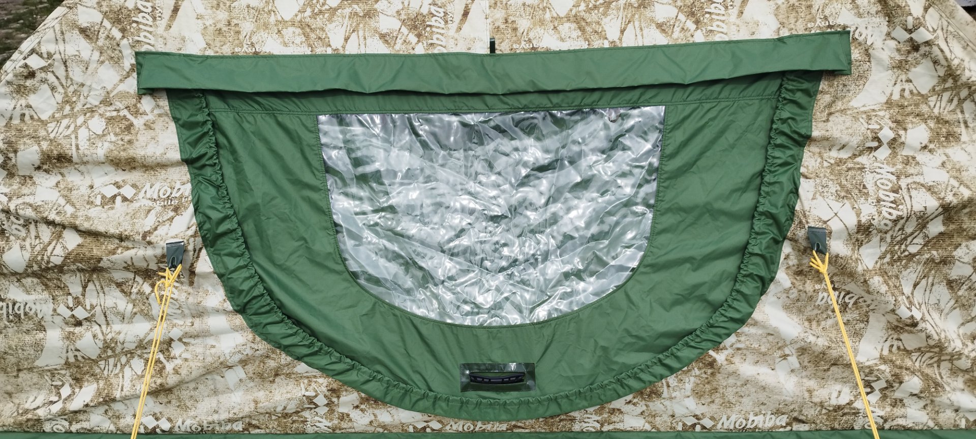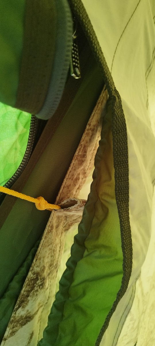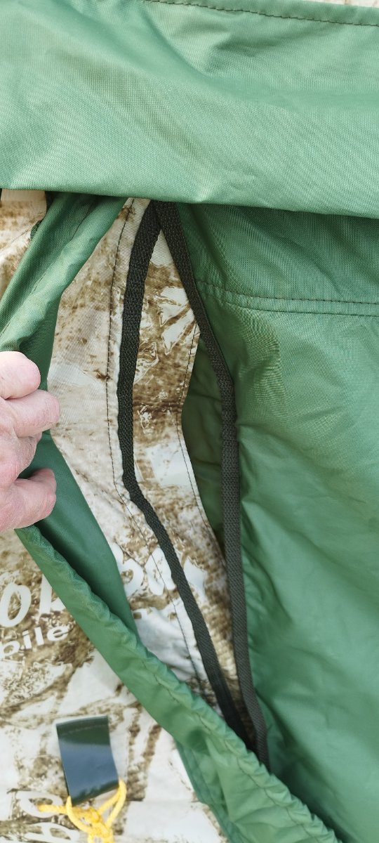 С дверью возникла непонятка. Накидная дверь больше размером и проем тоже, натяжения каркаса не хватает перекрыть его, по бокам образуются приличные щели. А если натянуть передние оттяжки, то они прям видны.