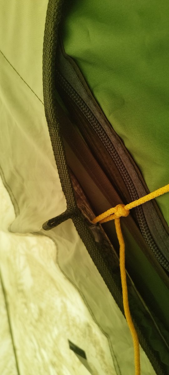 Изнутри на почти все завязки, кроме 5 самых верхних привязал карабинчики для ускорения сборки. В принципе можно еще угловые 4 убрать и лучше привязать тент к каркасу, чтоб не съезжал. А лучше бы вообще фирменные защелки там стояли и сразу к трубкам крепились. Итого карабичиков 12 шт., если только на стенках оставить, то 8 шт.
