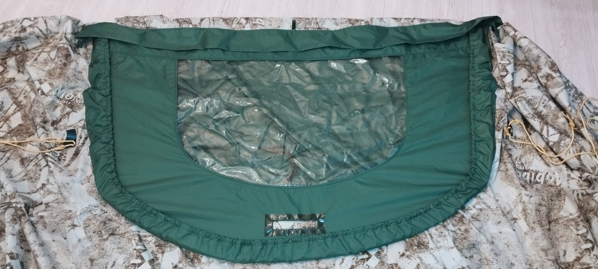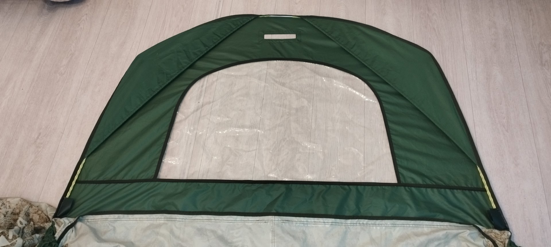 С дверью возникла непонятка. Накидная дверь больше размером и проем тоже, натяжения каркаса не хватает перекрыть его, по бокам образуются приличные щели. А если натянуть передние оттяжки, то они прям видны.