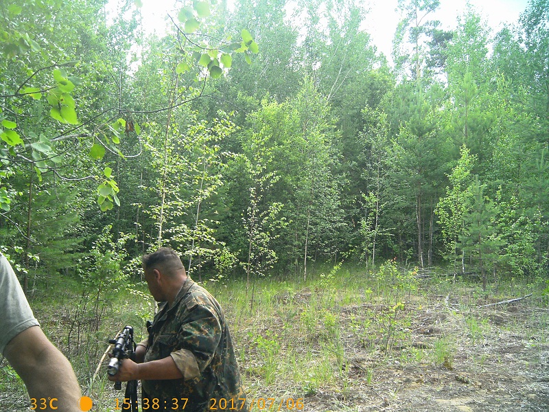 Вася проверяет камеру, а я его страхую. Дело происходит на приваде, активно посещаемой медведем, который в это время смотрит на нас метров с пятидесяти (мы потом лежку нашли).