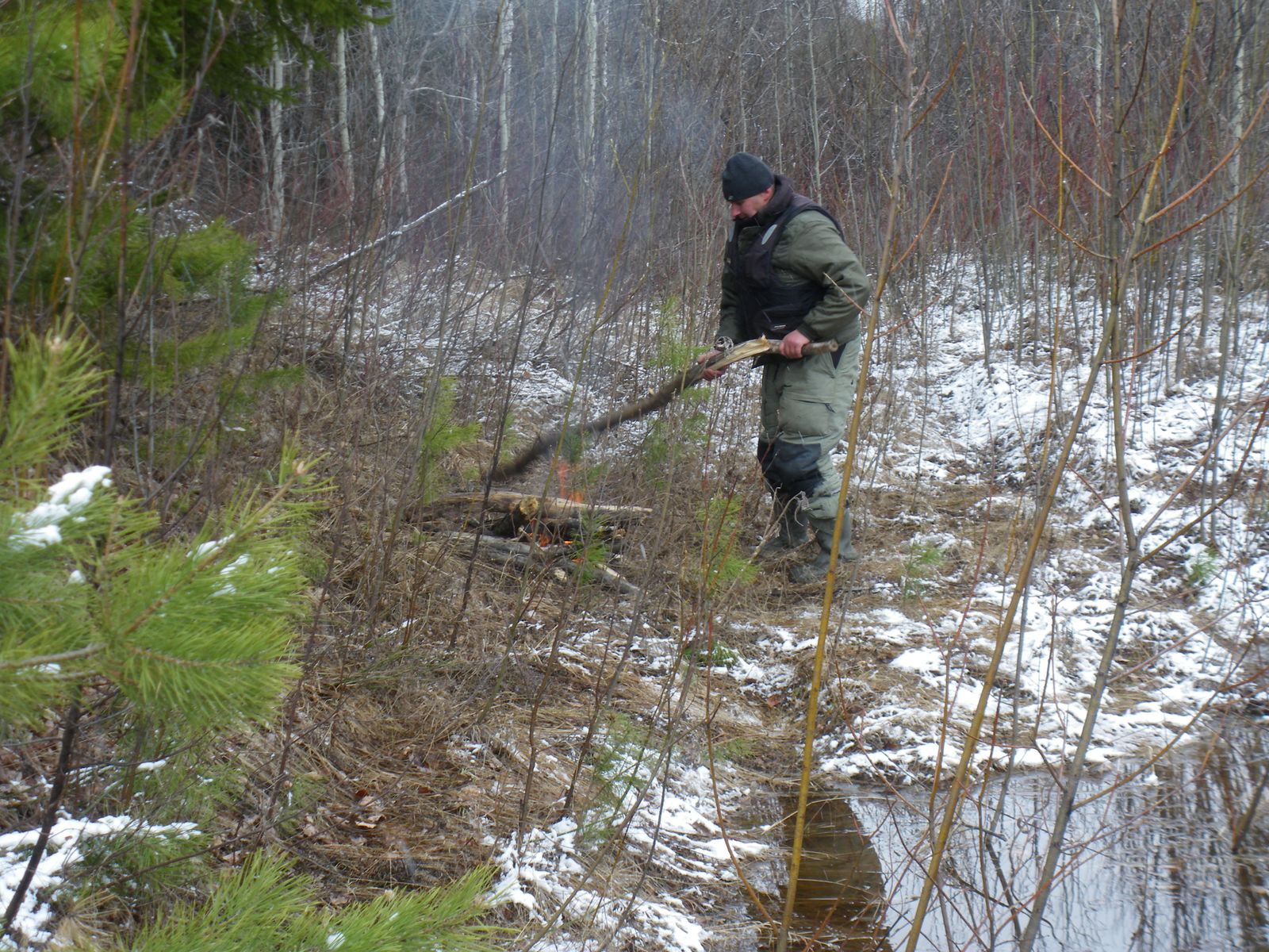 Пока мы все вместе разворачивали лагерь, а Василий с Николаем слушали мою лекцию о преимуществах «Мобибы» перед чем угодно вообще («долг каждого гвардейца – нести «Мобибу» в массы!»), Вася, не отрываясь от процесса, умудрился «приземлить» пару жирных крякашей, так что теперь и «Шикардос» обеспечен работой на вечер! (ну вот, я же говорил: «рыба будет»!) Палатка выросла как будто сама собой и совершенно органично (впрочем, как и всегда) вписалась в окружающий таёжный пейзаж. В качестве лирического отступления отмечу, что от «сотового» камуфляжа поначалу был не в восторге: больно он летний, больно зеленый. Что с таким делать в лесу зимой, а тем более – весной и осенью?! Но после пары недель, проведенной моей МБ-22 под мартовским солнцем, радикально изменил свое мнение! Впрочем, это и на фото видно! В общем, установив лагерь и выпив кофе из термоса, идем на разведку дороги и моста. Помните, я говорил, что у нас еще снег не везде сошел? Вот и вправду – не везде. Самые внимательные радиослушатели могут даже рассмотреть цепочку лисьих следов там, где стоит Василий.