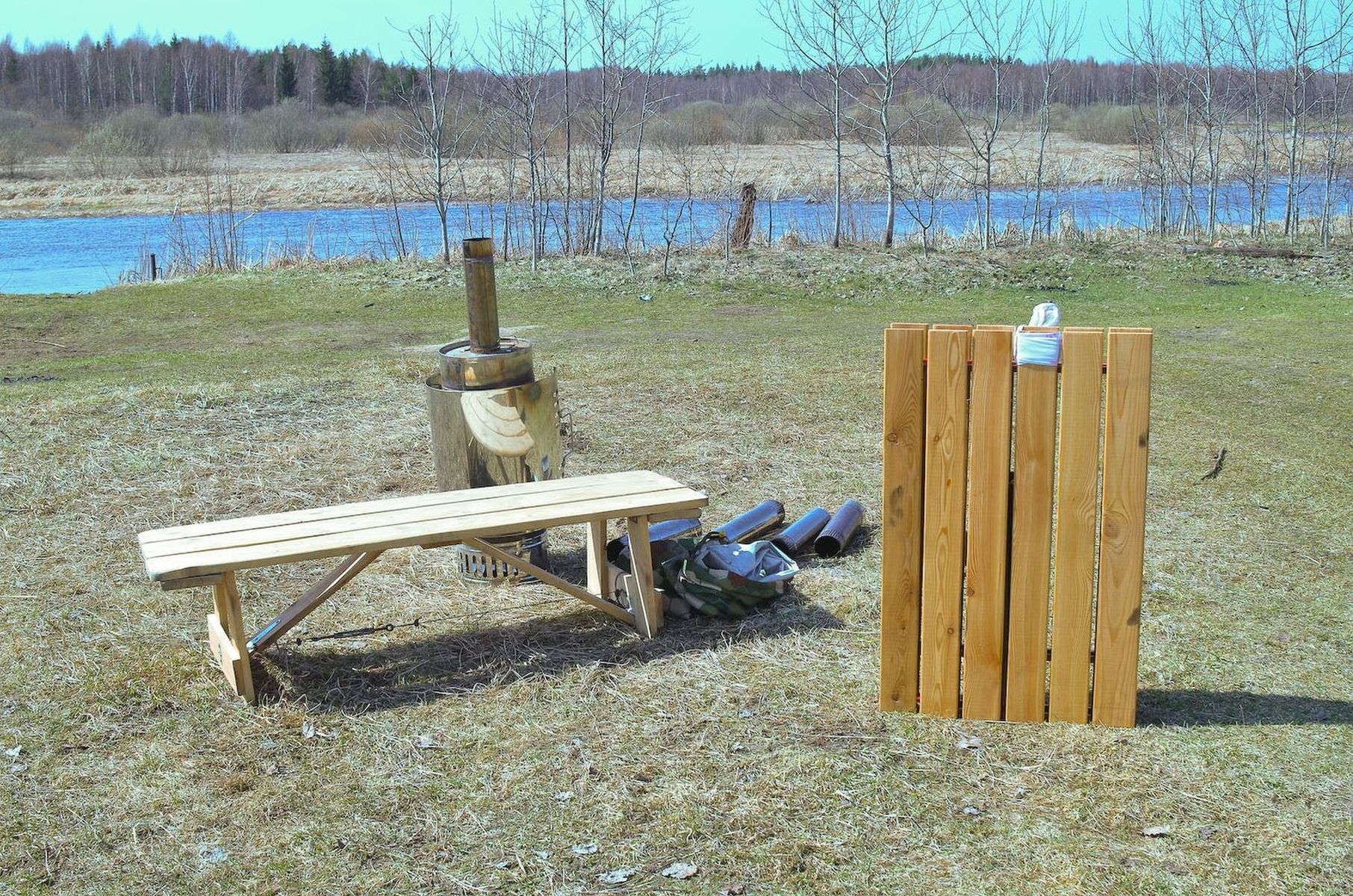 собирается за пару минут, но вот только тяжелый полок вышел просто жесть. компактный, да, но тяжеленный ужасно. взвесить нечем. В целом опыт получился интересный, но вывод для себя я сделал такой - потраченное время лучше бы по специальности подзаработал и на вырученные деньги купил фабричное изделие. Не очень-то сэкономил, а учитывая время - даже прогадал. В дальнейшем так и сделаю и закажу для большой палатки уже пару-тройку кроватей КС-350.