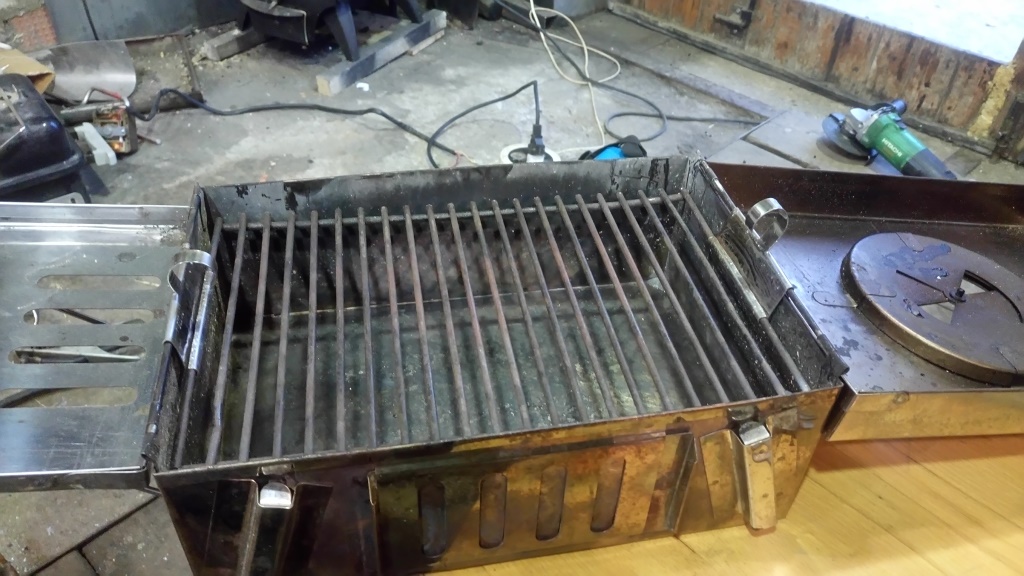 По решетке. Решетку я сделал из таковой от старой барбекюшницы (слово то какое!)). Поперечные прутки диаметром 4мм., продольные - 6мм. Размер сделал 225х335мм. 225 это немного уже мангала. Обращаю внимание и не повторяйте моих ошибок! Первоначально я сделал этот размер точно по ширине мангала. Но в процессе нагрева стенки на мангале немного отыграли вовнутрь и пришлось прибегать к помощи отвертки, чтобы выковырять решетку. А вставить ее на место было еще веселее!