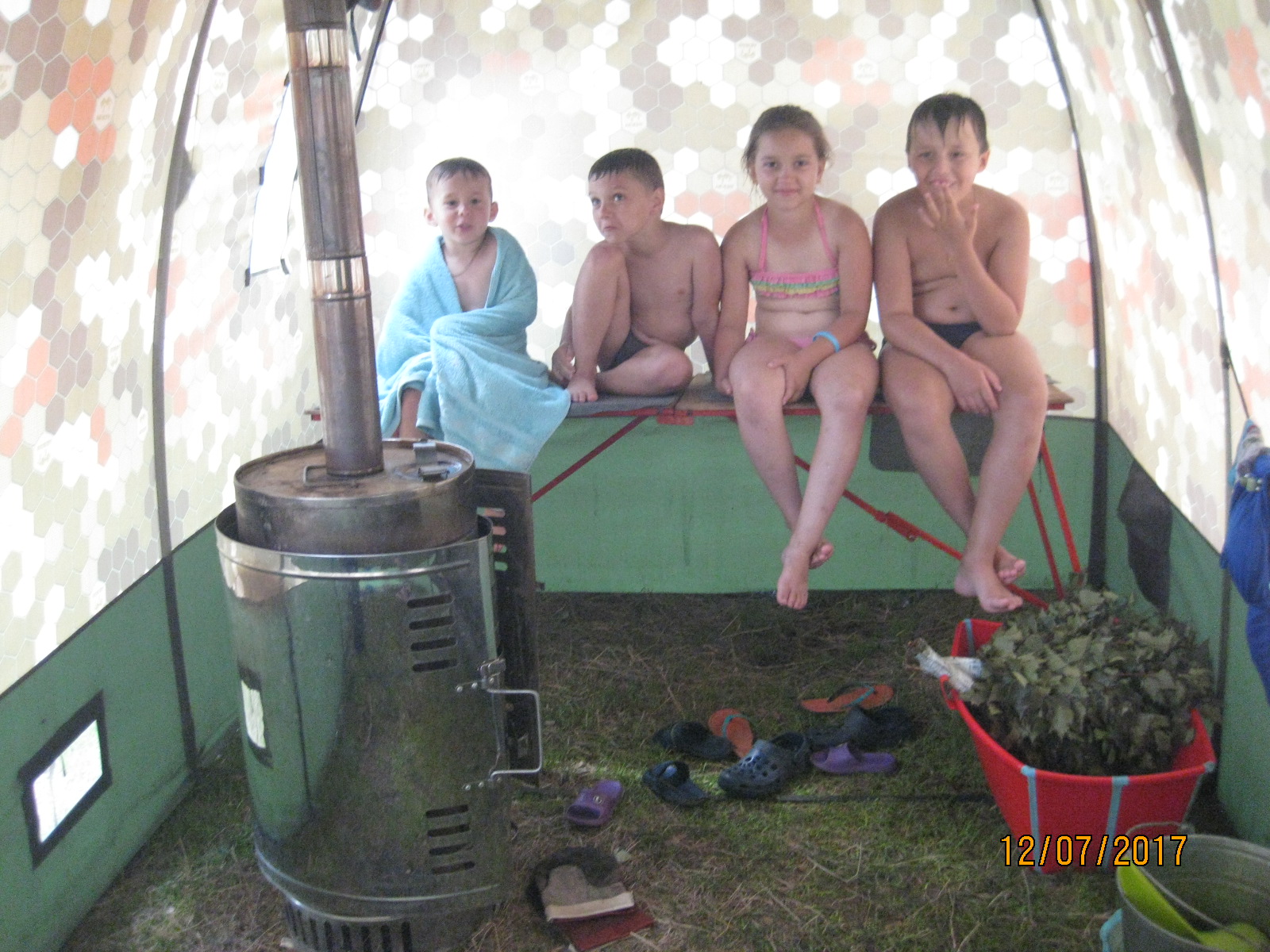 Выкладываю отчет с очередной поездки с Мобибой. Ездили на Белую двумя семьями с младшими детьми. Баня топилась вечером, когда спала жара. Ночевали вшестером в МБ-104.