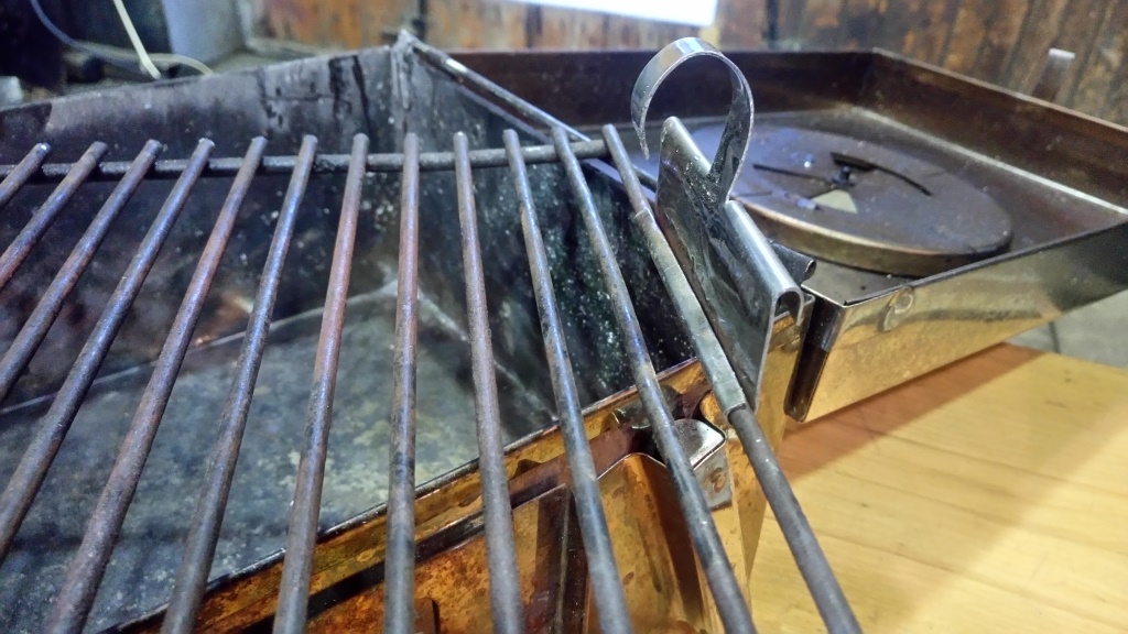 Крепление вырезано из нержавейки. Из квадрата 100х100мм. Из них 50мм приходится на крючек. Чертеж не прилагаю, т.к. все сугубо индивидуально. Зависит от ваших предпочтений и материала решетки. Я рассчитывал так, чтобы решетка была ниже кромки боковой стенки мангала на два сантиметра. В итоге должно получиться вот так
