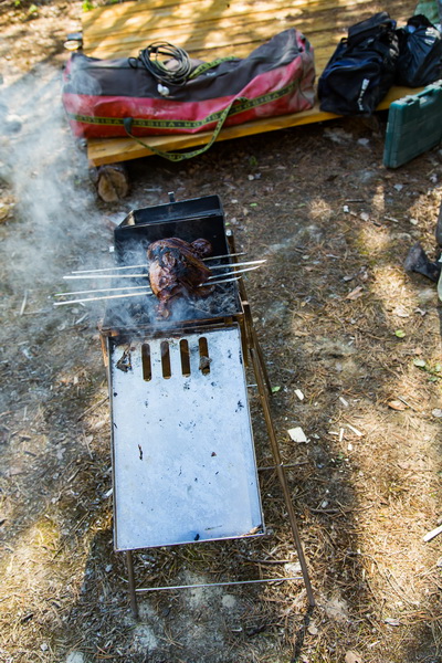 Кстати, пара слов о бане, теперь, когда ветку открыли - можно! В эту поездку взяли с собой «Кайфандру», от коей остались в полном восторге (что, вообще-то, уже даже и не удивляет). Поскольку это было далеко не первое использование мной данного изделия «Мобибы», технология его применения уже отработана и доведена до совершенства, в частности – подбор и заготовка топлива. Для всех любителей посталеварить в «Кайфандре» сообщаю, что лучшие (по крайней мере, из тех, которые мне довелось использовать) дрова для «Жиги» - сухая сильно смолистая сосна средней наколки, напиленная по 12-15 см. Как только печь получает такое топливо, она мгновенно забывает о том, что она цивильная «Жига» и превращается в разъяренную фурию по имени «Злюка», неуловимо быстро доводя банные кондиции из «жестких» до «нестерпимо жестких», затем – «нечеловеческих», и, очень скоро, до «не совместимых с жизнью». Спасает только Шаманка, протекающая в метре от бани. Так что буквально через несколько минут банных процедур приходится, как говорит егерь Василий «включать полный привод» (становиться на четвереньки – Б. П.; а все потому, что в полный рост не встанешь – жарко!) и быстро покидать палатку, плюхаясь в воду. Температура воды – традиционные – 4 см, но после второго захода в баню, температура воды воспринимается как комнатная, после третьего – как подогретая. В скобках отметим, что в предыдущий раз мне удавалось добиться такого эффекта весной, при использовании МБ-22 и «Паробомбы».