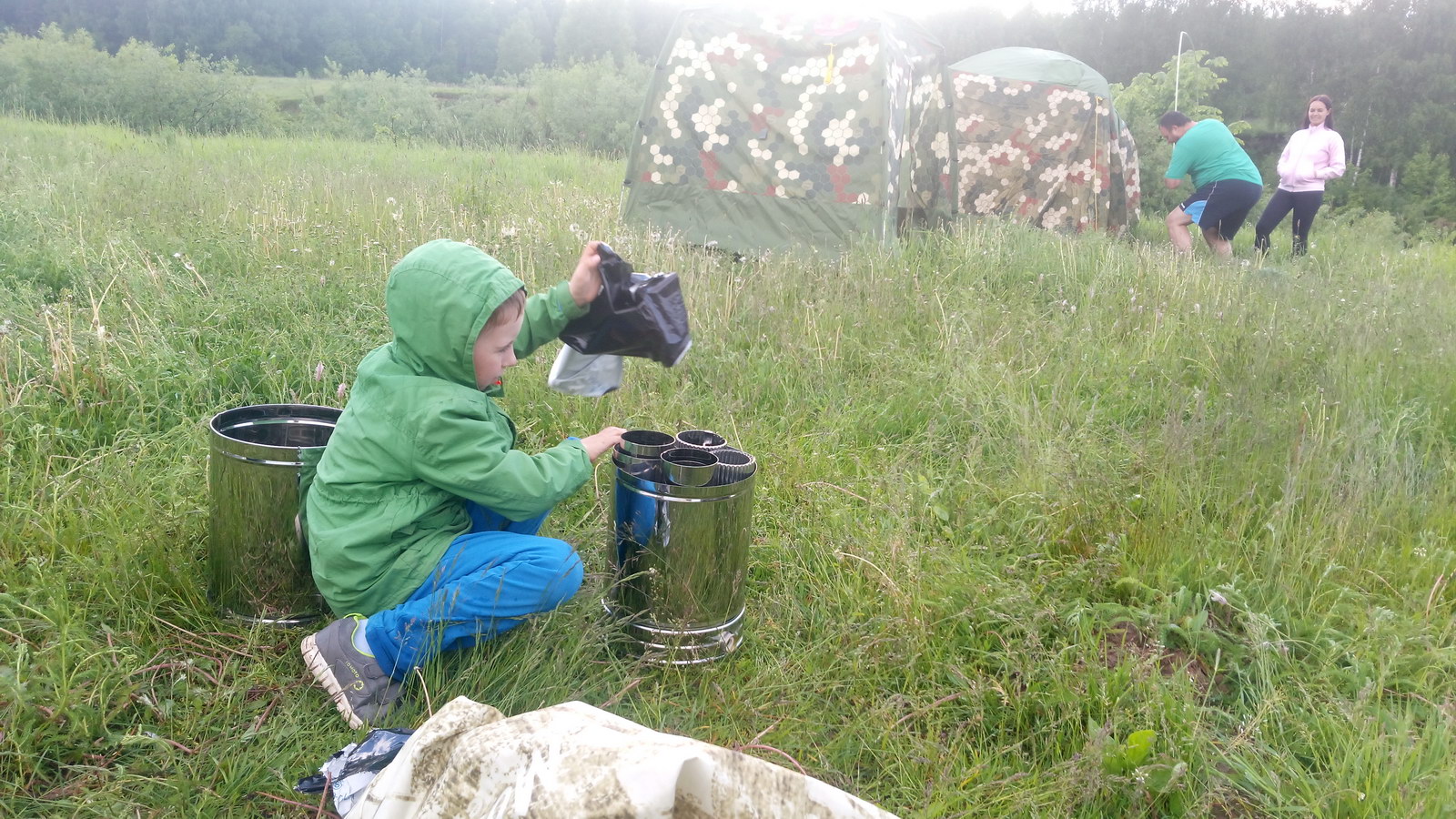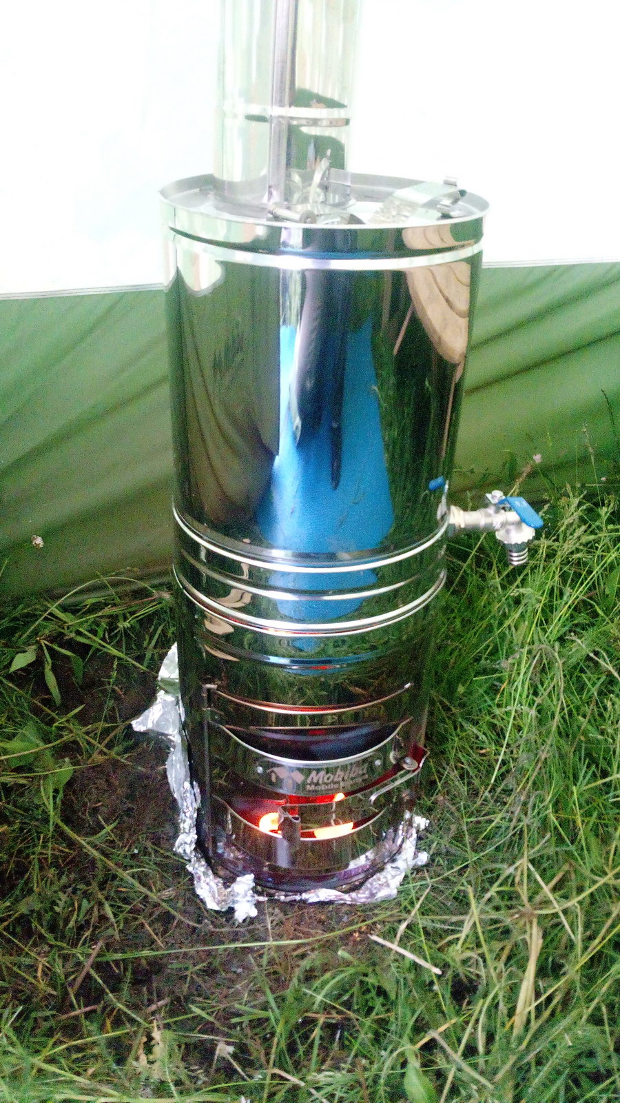 Коробка с Кайфандрой показалась нереально легкой и маленькой, какой-то игрушечной. Начали распаковывать - довольно большой шатер, дуги-поперечины, все собирается интуитивно и недвусмысленно. Печь ободрали от пленки и распаковали в момент: кто видел промо-ролик, собирает без задержек. С дымоходом напутать не получилось, там только один вариант сборки, не ошибешься. По совету с форума подкопнул землю и перевернул ее. Забегая вперед, скажу - этого мало. Надо было хотя бы пролить, но и это бы помогло ненадолго. Благодаря ровному днищу и сбалансированному центру печь держится устойчиво, не пытаясь завалиться на бок, как гравицапа с 20кг камней и баком. Исключительно удобное заливное отверстие в баке отметили просто все. К тому же сразу глазами видно уровень воды. Закрывашка дверцы топки сконструирована так, чтобы не обжечься, когда пальцами открываешь горящую топку. Правда при активном горении все же лучше или перчатки иметь или открывать щепкой. Кран в комплекте порадовал - с насечками для надевания трубки, надо будет подыскать по диаметру. Удобно будет наливать воду в тазик, не обжигаясь от брызг.