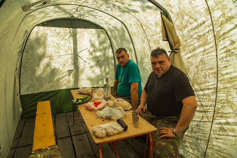 В общем, только банные процедуры помогают прийти в себя после рабочего дня, смыть коросту налипшей на пот пыли, расслабить «забитые» постоянным маханием хай-джеком руки и оттянутые и намятые карабинным погоном плечи. Опять же, баня и речка – спасение не только от жары, но и от гнуса. Например, вечер на лагере проходит так: