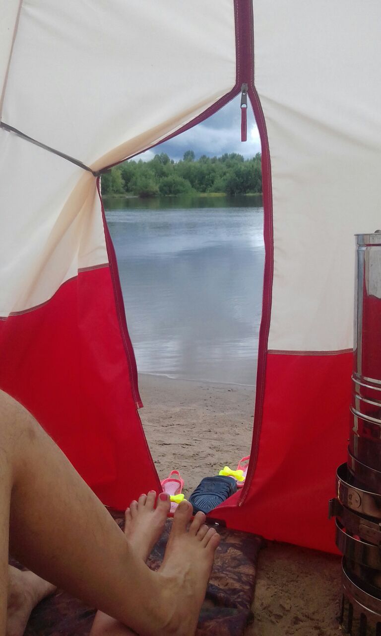 !Самое важное! Пока мы, насквозь промокшие, под дождем устанавливали Кайфандру, единственным желанием было просто оказаться защищенными от осадков. Но по мере того, как Жига набирала обороты (и это было непредсказуемо быстро), мы забывали про дискомфорт и проливной дождь «за бортом», с каждой минутой всё больше наслаждаясь благами Мобибы. Банная атмосфера за счет «хорошей» влажности позволяла получать удовольствие от Бани (да-да, с Большой буквы) без ощущения «гриля» (как в стационарной бане). Дышалось легко (спасибо притоку воздуха сквозь щель у входа – там, где кончается застежка-молния). До знакомства с Мобибой и я, и мой молодой человек, к бане относились больше как к жаркому помывочному помещению, где долго не выдержишь – распарил кожу, умылся и бегом на свежий воздух! С Мобибой открылся совсем другой горизонт – самое главное (лично для меня, в связи с тем, что в любой стационарной бане более 15 минут находиться не могу), комфортные ощущения, приятный жар без ощущения духоты! Далее могу долго перечислять все достоинства МБ: мобильность; возможность активного СЕМЕЙНОГО отдыха совсем другого уровня, чем ранее; при этом высокий уровень безопасности и надежности … и т. д. и т.п. (на форуме об этом написано, пишется и будет написано много)…