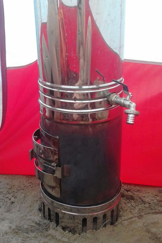Первым делом установили тент, спрятались в нем от дождя со всем движимым имуществом, и печь собирали уже в комфорте. Правда мне пришлось несколько раз выбегать за водой, чтоб заполнить бак Жиги. Очень переживала за дрова, которые я несла в хозяйственной сумке неприкрытыми сверху. Конечно, дрова стали полусырыми (или полумокрыми!?). Кусок газетки, щепки (одно старое полешко без труда «расщепилось») + обычные спички. К нашему удивлению, и тут всё прошло как по маслу. Печь заработала так быстро, что мы не успели удивиться.