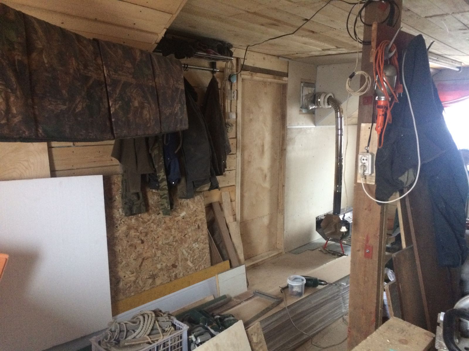 Труба от буржуйки выходила перпендикулярно через стену и потом наверх.