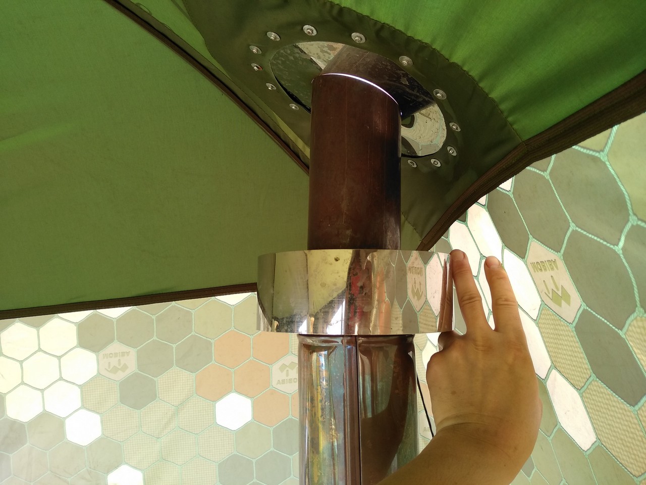 Любо дорого посмотреть не торцы дуг, они имеют заглушки с фирмовой символикой. Мелочь а приятно )))) Кстати материал дуг не пачкает как раньше руки алюминием. Ну Вы знаете - когда берете в руки алюминиевую проволоку она чернит пальцы рук. ТАк вот они анодированные и уже выглядят очень презентабельно и практично. В сумке от мобильной бани помещается кстати не только сама МБ-10 но и кружка, черпак и ППГ Собрал МБ-10 акв, привычно быстро и легко, несмотря на ветерок. Установил КЦ-2 эксклюзивную уже можно сказать печь. В тандеме с ППГ она выдает именно то что надо, мне очень понраву те кондиции которые она выдает летом. Как раз то что надо. Печь абсолютно всеядна, по пути к водоему приволок с лесу обычную падалицу - сушины которые были повалены ветром. Погибшие от весеннего пала деревья. напилил бензопилой и наколол в поленницу.
