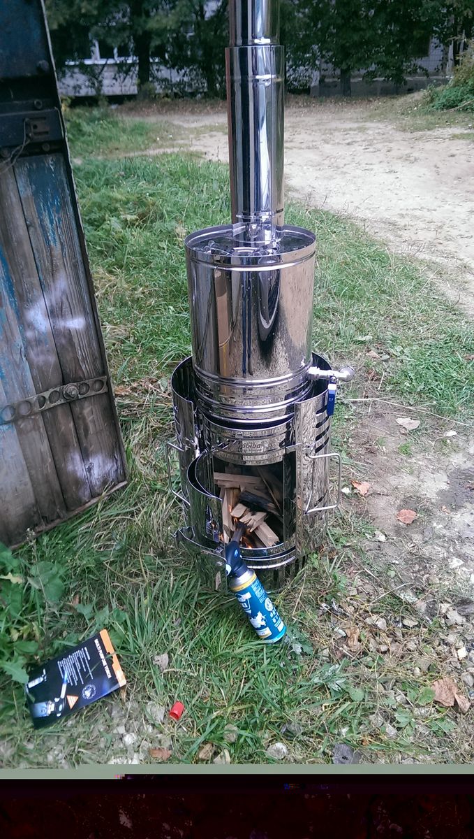 Обжег печку при помощи 2-х брикетов, залив чуть больше половины бака воды. Вода закипела довольно быстро, время не засекал, но пока доставал ИНИПИ из машины и раскладывал для установки вода уже начала булькать.