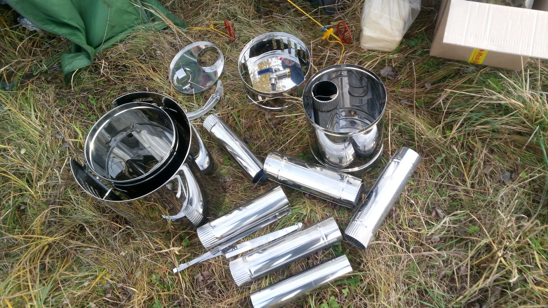 палатка - кайфандра, пол утеплен пенофолом и покрыт кольчужным резиновым ковриком "антискольжения". полок - ПС-350, печь - КЦ2 конечно, дрова березовые, дубовые и легендарный РУФ из Леруа, не дающий золы (и правда). Вода из пруда, бак старался держать полным, т.е. на 90%. 1. распаковка.