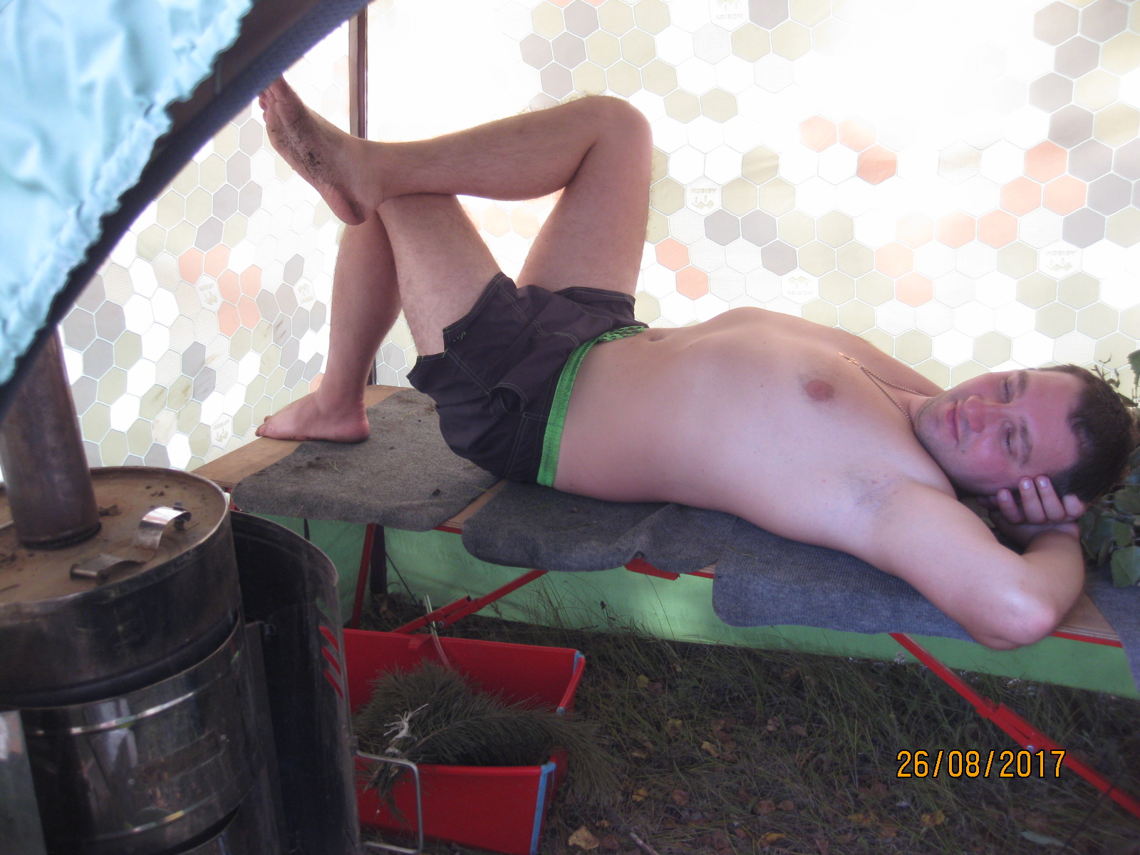 ногами к двери. в ногах стоит ящик пластиковый. RVbox700 - в нём горелочка и посуда.