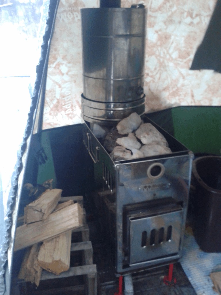 Зимой я юбку снегом закидываю, пол утеплён изолоном из строительного магазина! Печка тянет кислород только в путь, особенно паробомба (топка большая). Ткань палатки кислород не пропускает, да и плюс один или несколько человек в палатке! Всё же, маленькую щёлочку я оставляю
