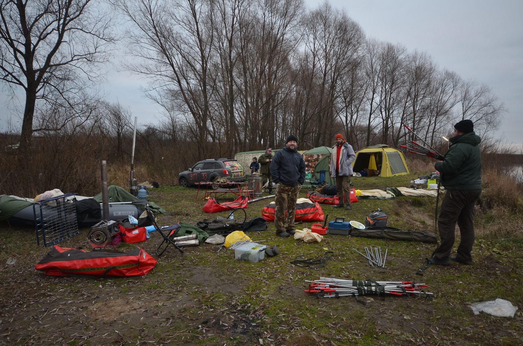 Спустя какое-то время выяснился виновник шутки, который раздал оставшиеся баллончики краски детям, а уж они-то оторвались вволю и творчески раскрасили папе уазик. и уазик дяди Ильи и фургончик дядюшки Мокуса(зачеркнуто) Shmon'a а потом мы стали палить дымовые шашки с красивым, но невкусным дымом. поставили свежекупленную на тот момент по объявлению форума в разделе куплю-продам МБ-332, это было первое парение в сей новой для меня палатке (она и так как новая, хоть и много лет ей!) Та половина лагеря, которую мне можно сейчас опубликовать, выглядела так вот наш Шеф-повар-подрывниктудытьего готовит завтрак а тут готовится грандиозный суп на обед на всю банду после сытного обеда развернули лодку и покатались по ледяной Оке.. Илья, как наиболее трезвый (вы видите его грустные глаза? просто пиво хорошее уже кончилось), вызвался в капитаны и лоцманы одновременно. А я? Я конечно тоже трезвый, но в это время уже увлеченно парился, отвлекшись только схватить фотоаппарат для фотографии Потом, пока не стерли все надписи с машин пошли фотографироваться всем табором