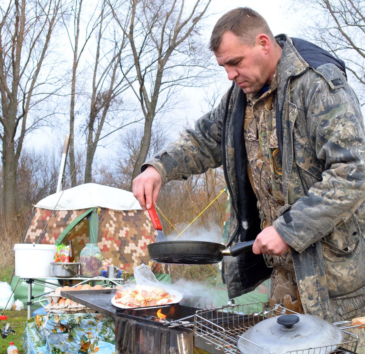Спустя какое-то время выяснился виновник шутки, который раздал оставшиеся баллончики краски детям, а уж они-то оторвались вволю и творчески раскрасили папе уазик. и уазик дяди Ильи и фургончик дядюшки Мокуса(зачеркнуто) Shmon'a а потом мы стали палить дымовые шашки с красивым, но невкусным дымом. поставили свежекупленную на тот момент по объявлению форума в разделе куплю-продам МБ-332, это было первое парение в сей новой для меня палатке (она и так как новая, хоть и много лет ей!) Та половина лагеря, которую мне можно сейчас опубликовать, выглядела так вот наш Шеф-повар-подрывниктудытьего готовит завтрак а тут готовится грандиозный суп на обед на всю банду после сытного обеда развернули лодку и покатались по ледяной Оке.. Илья, как наиболее трезвый (вы видите его грустные глаза? просто пиво хорошее уже кончилось), вызвался в капитаны и лоцманы одновременно. А я? Я конечно тоже трезвый, но в это время уже увлеченно парился, отвлекшись только схватить фотоаппарат для фотографии Потом, пока не стерли все надписи с машин пошли фотографироваться всем табором