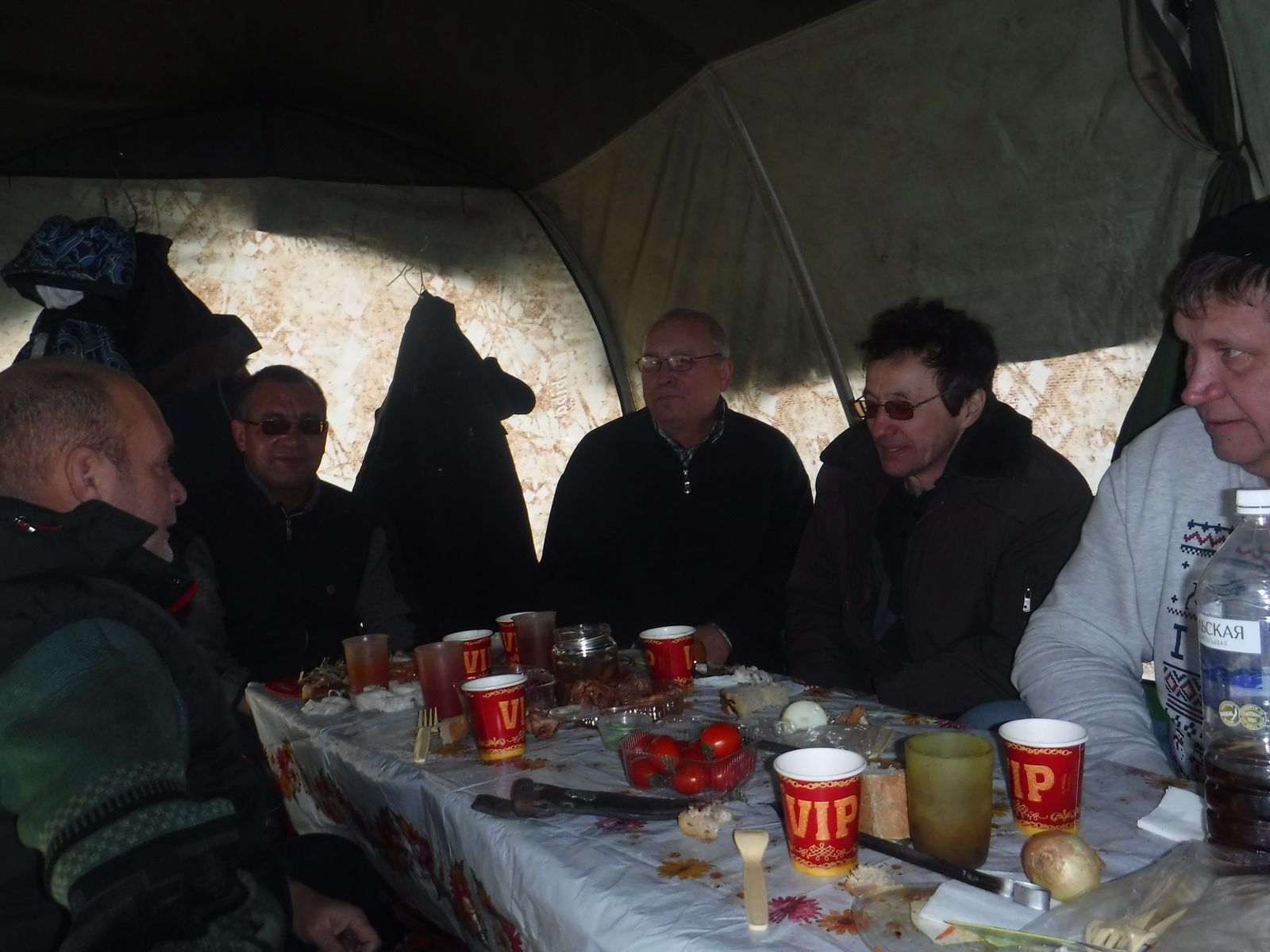 Но надо ещё мужиков собрать, тех друзей, с которыми я 25-30 лет вместе. Достаём с морозилки самого крупного рыба, бёрём 3 кг свиной вырезки, разливного коньяку по литру на брата и вперёд. Снегу навалило, на улице -20, красота! При таком количестве спиртного баню решили не топить, а просто посидеть в 104-й. В 11.00 уже были на нашей поляне за городом, быстро установили 104-ю, Согру, Шикардос и начали праздновать. Закоптили ленка и затем в два захода жарили мясо. Вместо стола использовали полок. Планировалось 8 человек, но смогли только 6. Всем хватило места с запасом. Нам 300 лет на шестерых. Давно не встречались таким составом, поэтому сидели до позднего вечера, даже песни пели. Собирались в свете фар, ничего вроде не забыли. Это уже второе ДР в Мобибе.