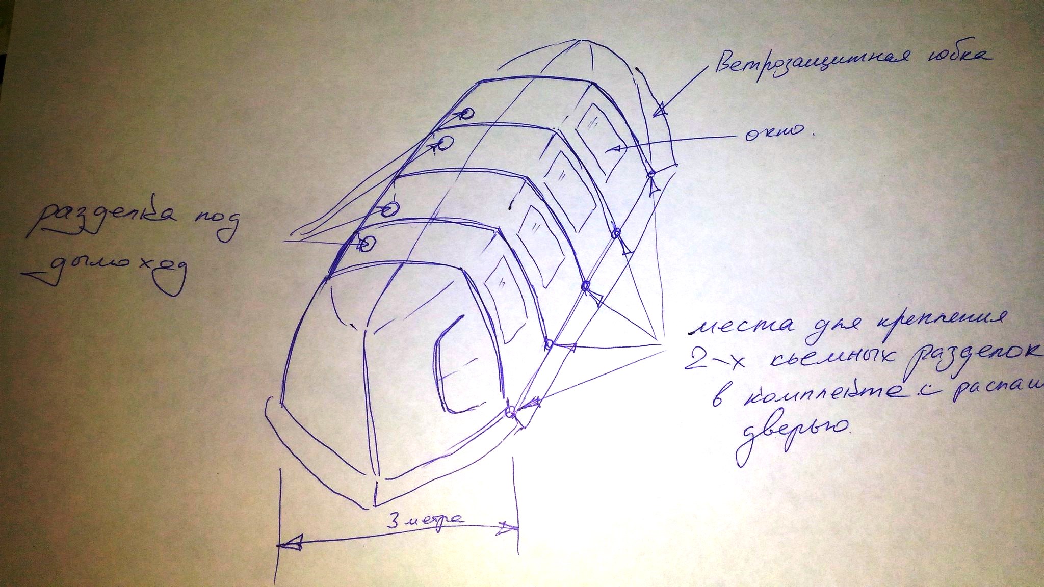 Допустим "АКПС-443", или может быть "Наутилус-443 м-1". Почему 443? Потому что основной купол,до торцевых куполообразных сужений, похож по принципу сборки на МБ-442 М-2. Но в других габаритах, габариты 4*3 метра, а торцы куполообразные пристегиваются/монтируются к основному телу. Но выглядеть это будет единым целым. Потому что сшито будет единым куполом. Мниться мне что это обязательно двухслойное (а может даже и 3-х слойное) изделие, ибо теплее и гарантирует использование круглый год.