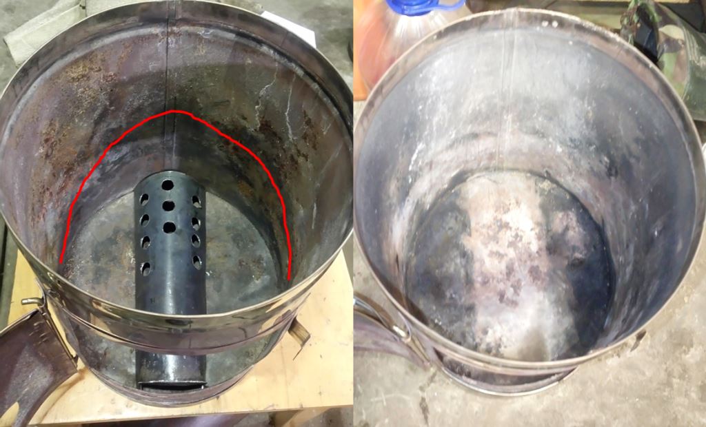Для наглядности, зачем нам это нада?, два снимка рядом. На первом (без хреновины) я красненьким указал "мертвую зону" у задней стенки. На второй (с хреновиной) - хорошо видно, что горение активно и у задней стенки и по бокам.