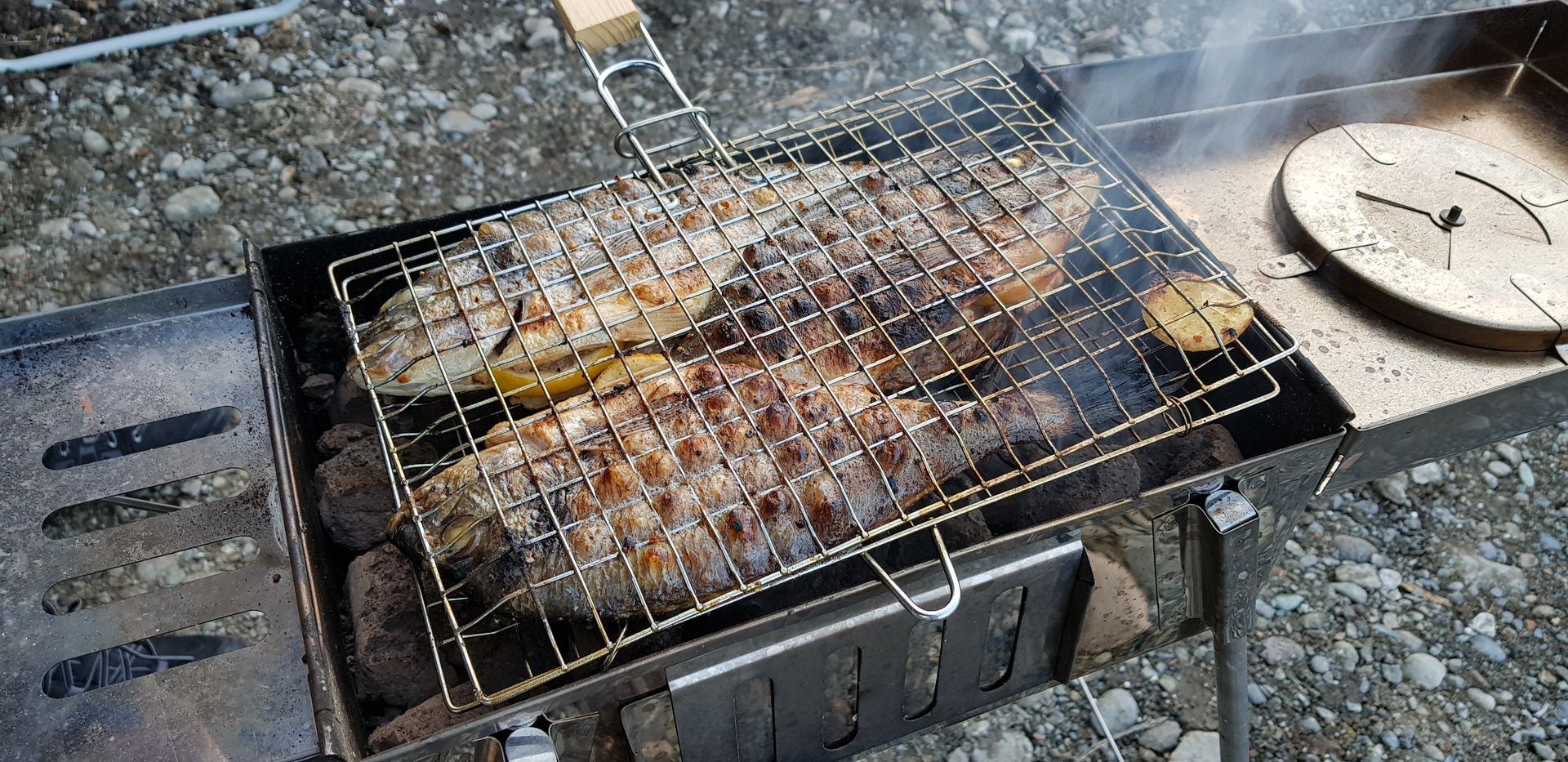 Но если говорить о Шикардосе, то надо обязательно упомянуть еще одну тему. Это приготовление рыбы на нем. Грешен, сильно люблю рыбу на гриле. Поэтому нам не в тягость тащить с собой на Горный Алтай в специальном холодильнике свежую рыбу Дорадо или Сибас.