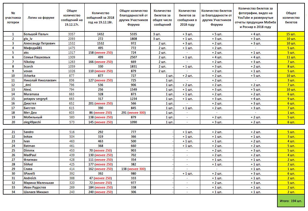 Большое количество бонусных билетов получено участниками лотереи за благодарности от других участников Форума, публикации фотографий, видео на YouTube и развернутые отчеты продукции Мобиба и Роснар!